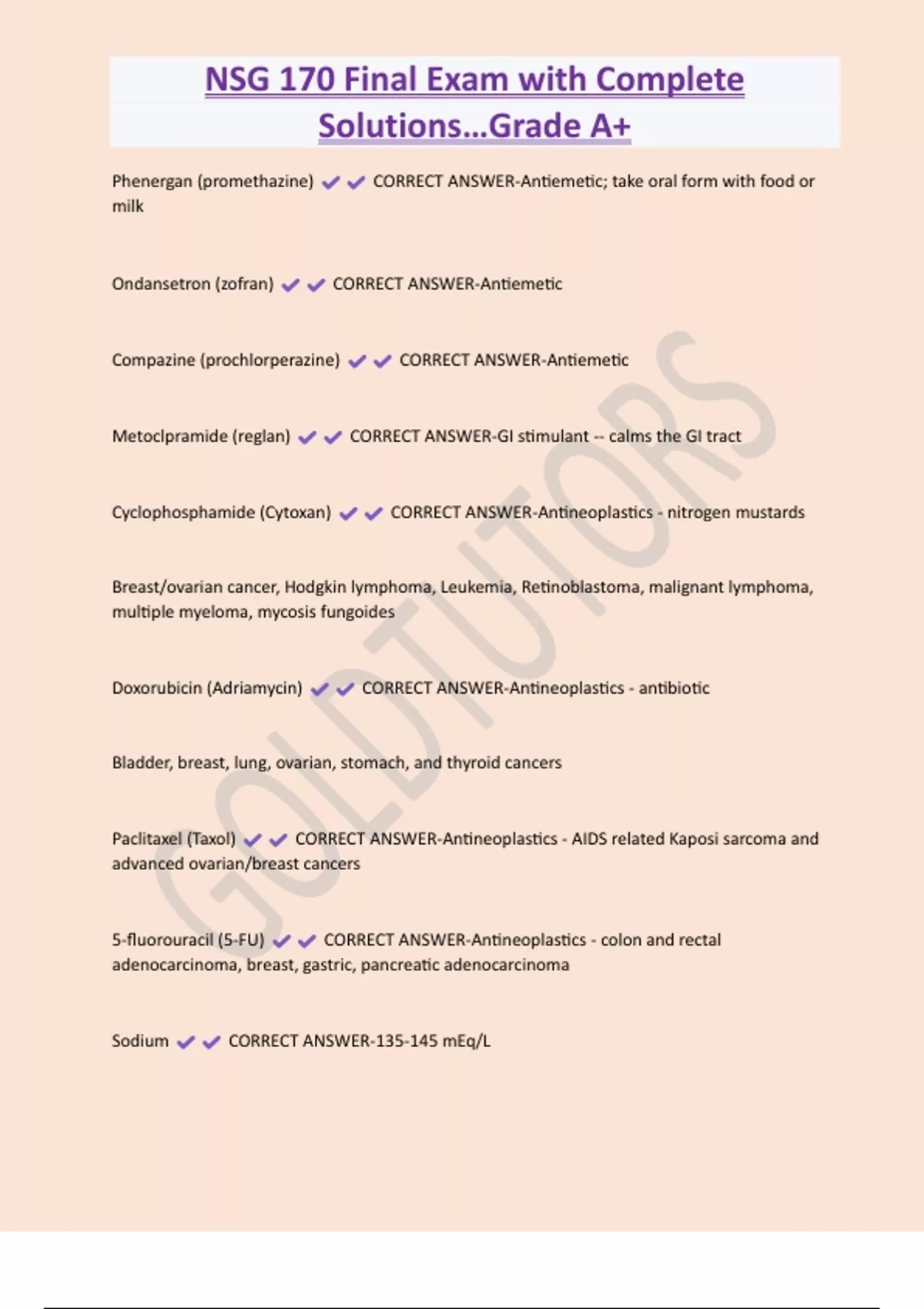NSG 170 Final Exam with Complete Solutions…Grade A+ Phenergan (promethazine) CORRECT ANSWER-Antiemetic; take oral form with food or milk Ondansetron (zofran) CORRECT ANSWER-Antiemetic Compazine (prochlorperazine) CORRECT ANSWER-Antiemetic Metoclpramide (reglan) CORRECT ANSWER-GI stimulant -- calms the GI tract Cyclophosphamide (Cytoxan) CORRECT ANSWER-Antineoplastics - nitrogen mustards Breast/ovarian cancer, Hodgkin lymphoma, Leukemia, Retinoblastoma, malignant lymphoma, multiple myeloma, mycosis fungoides
