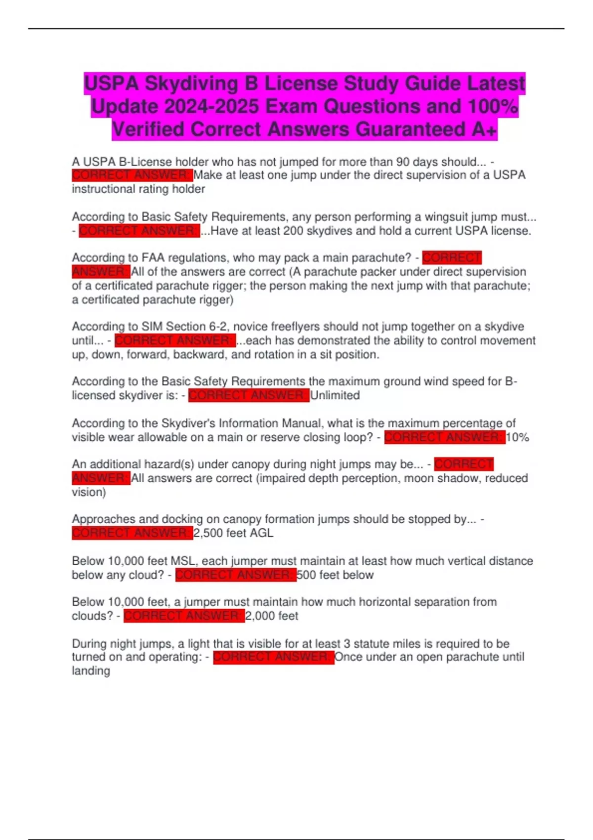 USPA Skydiving B License Study Guide Latest Update Exam Questions and 100% Verified Correct Answers Guaranteed A+