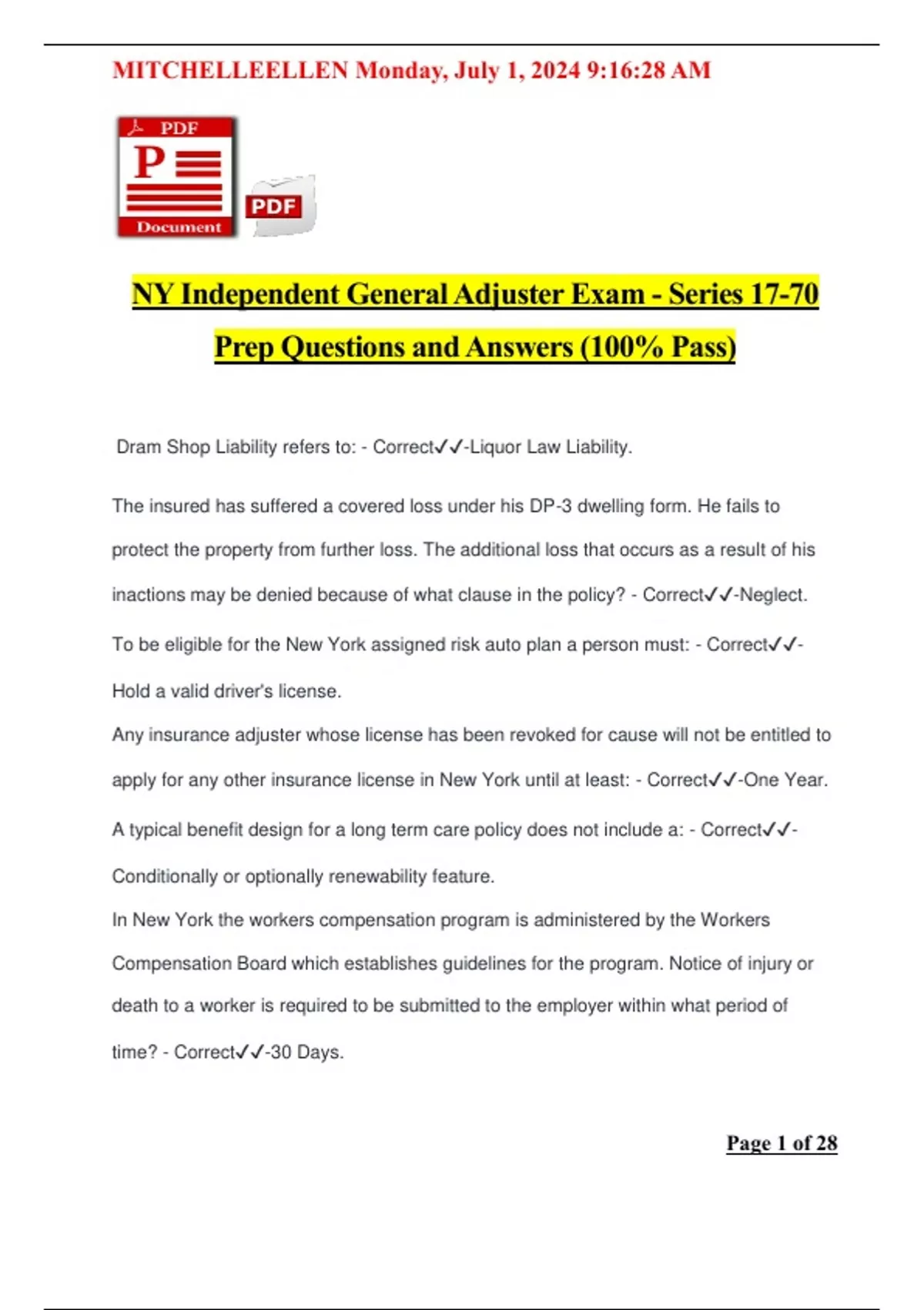 NY Independent General Adjuster Exam - Series 17-70 Prep Questions and Answers (100% Pass)