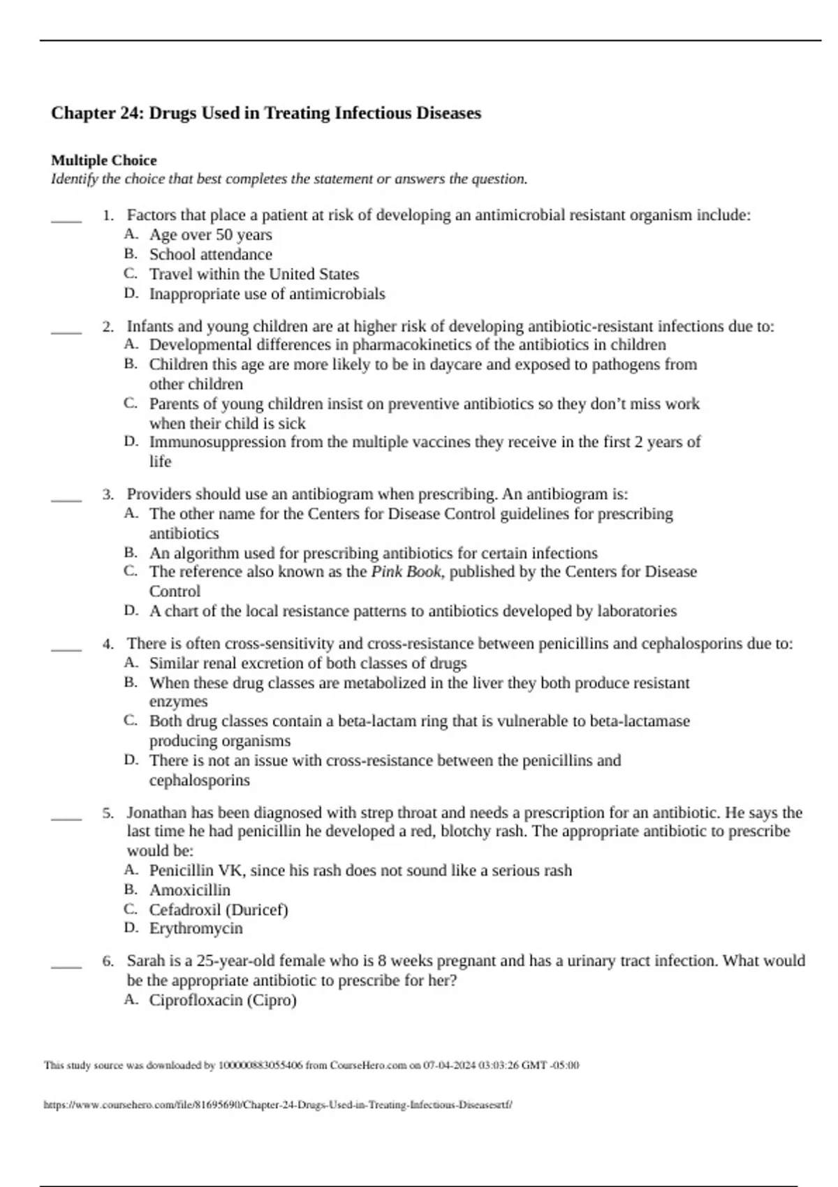 NR 508 Chapter 24: Drugs Used in Treating Infectious Diseases – With 100 % Correct Answers Multiple Choice Identify the choice that best completes the statement or answers the question. 1. Factors that place a patient at risk of developing an antimicrobial resistant organism include: A. Age over 50 years B. School attendance C. Travel within the United States D. Inappropriate use of antimicrobials 2. Infants and young children are at higher risk of developing antibiotic-resistant infections due to: A. Developmental differences in pharmacokinetics of the antibiotics in children B. Children this age are more likely to be in daycare and exposed to pathogens from other children C. Parents of young children insist on preventive antibiotics so they don’t miss work when their child is sick D. Immunosuppression from the multiple vaccines they receive in the first 2 years of life 3. Providers should use an antibiogram when prescribing. An antibiogram is: A. The other name for the Centers for Disease Control guidelines for prescribing antibiotics B. An algorithm used for prescribing antibiotics for certain infections C. The reference also known as the Pink Book, published by the Centers for Disease Control D. A chart of the local resistance patterns to antibiotics developed by laboratories 4. There is often cross-sensitivity and cross-resistance between penicillins and cephalosporins due to: A. Similar renal excretion of both classes of drugs B. When these drug classes are metabolized in the liver they both produce resistant enzymes C. Both drug classes contain a beta-lactam ring that is vulnerable to beta-lactamase producing organisms D. There is not an issue with cross-resistance between the penicillins and cephalosporins 5. Jonathan has been diagnosed with strep throat and needs a prescription for an antibiotic. He says the last time he had penicillin he developed a red, blotchy rash. The appropriate antibiotic to prescribe would be: A. Penicillin VK, since his rash does not sound like a serious rash B. Amoxicillin C. Cefadroxil (Duricef) D. Erythromycin 6. Sarah is a 25-year-old female who is 8 weeks pregnant and has a urinary tract infection. What would be the appropriate antibiotic to prescribe for her? A. Ciprofloxacin (Cipro) B. Amoxicillin (Trimox) C. Doxycycline D. Trimethoprim-sulfamethoxazole (Septra) 7. Pong-tai is a 12 month old who is being treated with amoxicillin for acute otitis media. His parents call the clinic and say he has developed diarrhea. The appropriate action would be to: A. Advise the parents that some diarrhea is normal with amoxicillin and try feeding him yogurt daily B. Change the antibiotic to one that is less of a gastrointestinal irritant C. Order stool cultures for suspected viral pathogens not treated by the amoxicillin D. Recommend increased fluids and fiber in his diet 8. Lauren is a 13 year old who comes to clinic with a 4-day history of cough, low grade fever, and rhinorrhea. When she blows her nose or coughs the mucous is greenish-yellow. The appropriate antibiotic to prescribe would be: A. Amoxicillin B. Amoxicillin/clavulanate C. TMP/SMZ (Septra) D. None 9. Joanna had a small ventricle septal defect (VSD) repaired when she was 3 years old and has no residual cardiac problems. She is now 28 and is requesting prophylactic antibiotics for an upcoming dental visit. The appropriate antibiotic to prescribe according to current American College of Cardiology and the American Heart Association guidelines is: A. No antibiotic required for dental procedures B. Amoxicillin 2 grams 1 hour before the procedure C. Ampicillin 2 grams IM or IV 30 minutes before the procedure D. Azithromycin 1 gram 1 hour before the procedure 10. To prevent further development of antibacterial resistance it is recommended fluoroquinolones be reserved for treatment of: A. Urinary tract infections in young women B. Upper respiratory infections in adults C. Skin and soft tissue infections in adults D. Community-acquired pneumonia in patients with comorbidities 11. Fluoroquinolones have a Black Box warning regarding even months after treatment. A. Renal dysfunction B. Hepatic toxicity C. Tendon rupture D. Development of glaucoma 12. Janet was recently treated with clindamycin for an infection. She calls the advice nurse because she is having frequent diarrhea that she thinks may have blood in it. What would be the appropriate care for her? A. Encourage increased fluids and fiber B. Assess for pseudomembranous colitis C. Advise her to eat yogurt daily to help restore her gut bacteria D. Start her on an antidiarrheal medication 13. Keng has chronic hepatitis that has led to mildly impaired liver function. He has an infection that would be best treated by a macrolide. Which would be the best choice for a patient with liver dysfunction? A. Azithromycin (Zithromax) B. Clarithromycin (Biaxin) C. Erythromycin (E-mycin) D. None of the above 14. Jamie has glucose-6-phosphate dehydrogenase deficiency (G6PD) and requires an antibiotic. Which class of antibiotics should be avoided in this patient? A. Penicillins B. Macrolides C. Cephalosporins D. Sulfonamides 15. If a patient is allergic to sulfonamide antibiotics, he or she will most likely have cross-sensitivity to: A. Loop diuretics B. Sulfonylureas C. Thiazide diuretics D. All of the above 16. Tetracyclines such as minocycline are safe to use in: A. Pregnant women B. Adolescents C. Patients with renal dysfunction D. Patients with hepatic dysfunction 17. Tetracyclines should not be prescribed to children younger than 8 years due to: A. Risk of developing cartilage problems B. Development of significant diarrhea C. Risk of kernicterus D. Adverse effects on bone growth 18. Nicole is a 16 year old who is taking minocycline for acne. She comes to the clinic complaining of a headache. What would be the plan of care? A. Advise acetaminophen or ibuprofen as needed for headaches B. Prescribe sumatriptan (Imitrex) to be taken at the onset of the headache
