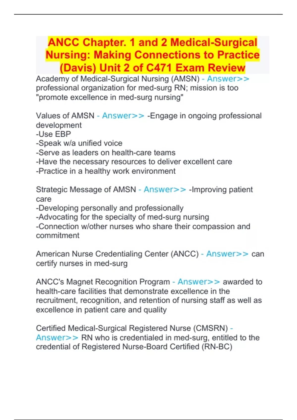 ANCC Chapter. 1 and 2 Medical-Surgical Nursing: Making Connections to Practice (Davis) Unit 2 of C471 Exam Review
