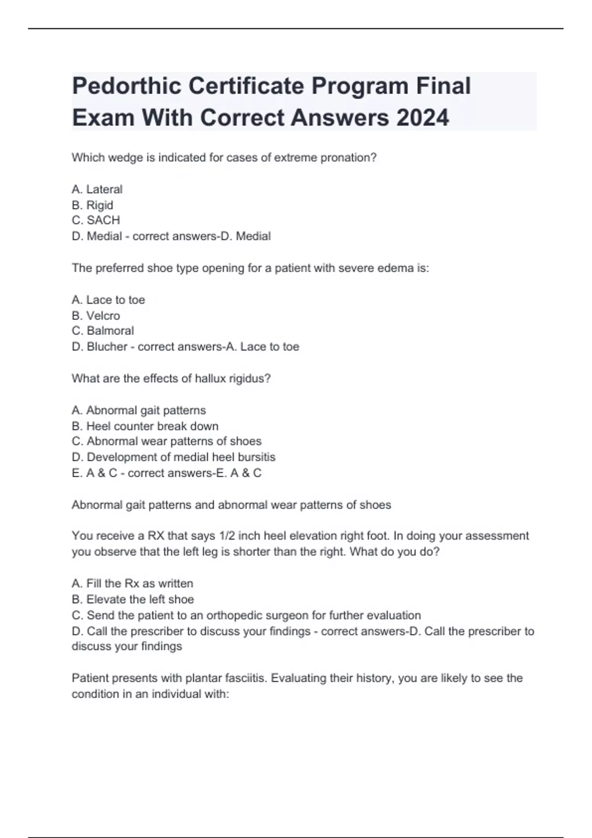Pedorthic Certificate Program Final Exam With Correct Answers 2024