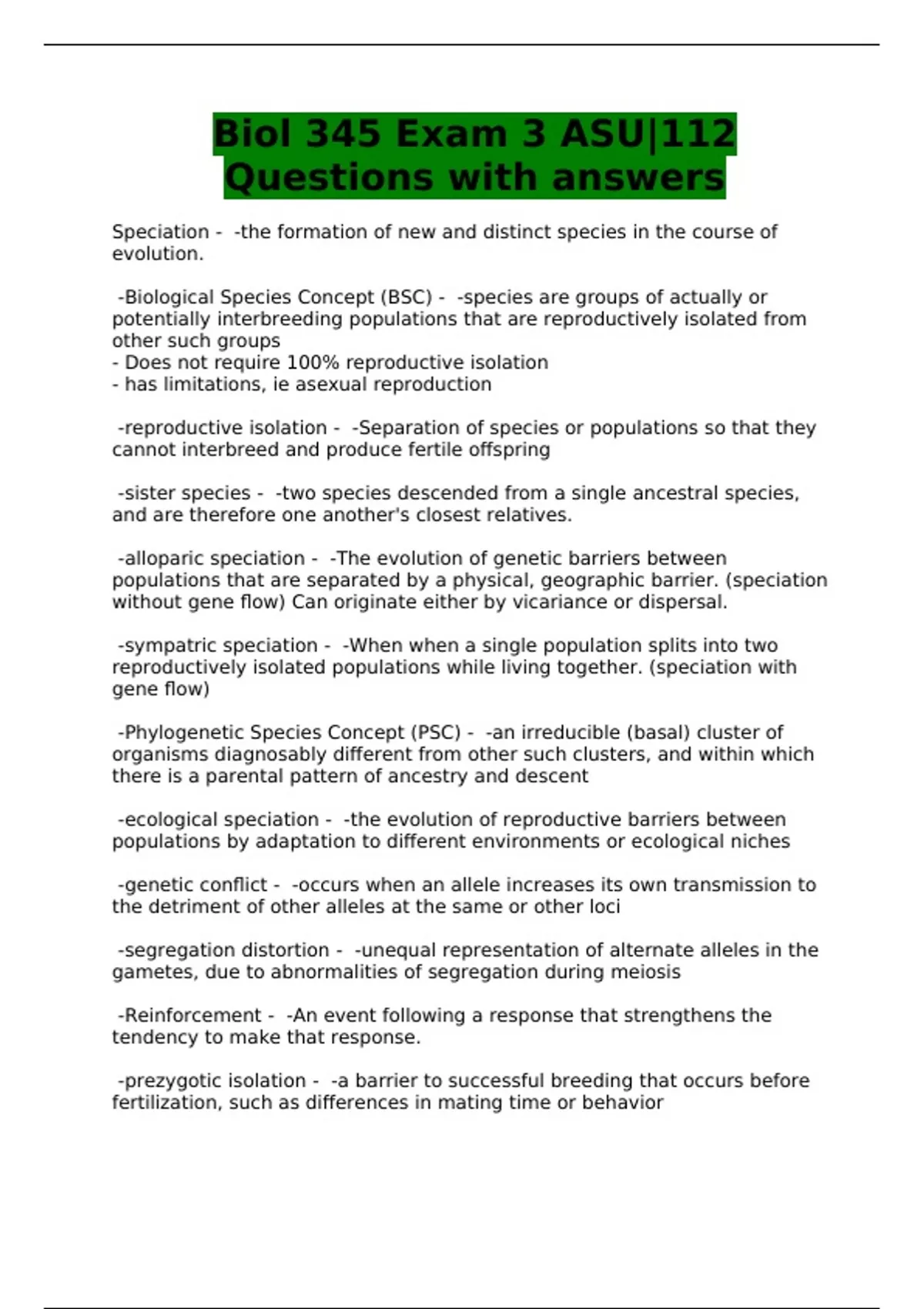 Biol 345 Exam 3 ASU|112 Questions with answers