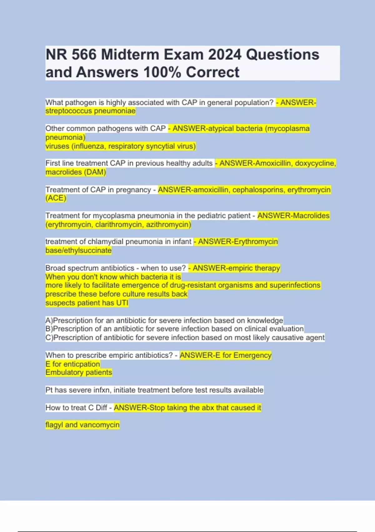 NR 566 Midterm Exam 2024 Questions and Answers 100% CorrectNR 566 Midterm Exam 2024 Questions and Answers 100% CorrectNR 566 Midterm Exam 2024 Questions and Answers 100% CorrectNR 566 Midterm Exam 2024 Questions and Answers 100% Correct What pathogen is highly associated with CAP in general population? - ANSWER-streptococcus pneumoniae Other common pathogens with CAP - ANSWER-atypical bacteria (mycoplasma pneumonia) viruses (influenza, respiratory syncytial virus) First line treatment CAP in previous healthy adults - ANSWER-Amoxicillin, doxycycline, macrolides (DAM)