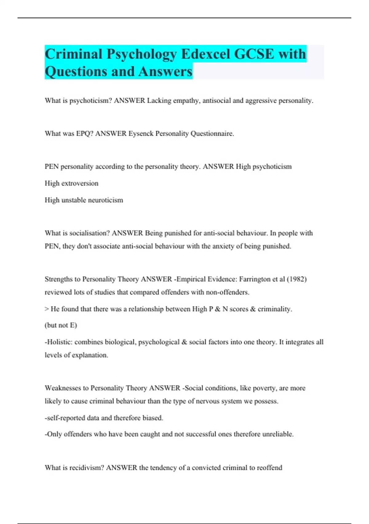 Criminal Psychology Edexcel GCSE with Questions and Answers What is psychoticism? ANSWER Lacking empathy, antisocial and aggressive personality. What was EPQ? ANSWER Eysenck Personality Questionnaire. PEN personality according to the personality theory. ANSWER High psychoticism High extroversion High unstable neuroticism What is socialisation? ANSWER Being punished for anti-social behaviour. In people with PEN, they don't associate anti-social behaviour with the anxiety of being punished. Strengths to Personality Theory ANSWER -Empirical Evidence: Farrington et al (1982) reviewed lots of studies that compared offenders with non-offenders. > He found that there was a relationship between High P & N scores & criminality. (but not E) -Holistic: combines biological, psychological & social factors into one theory. It integrates all levels of explanation. Weaknesses to Personality Theory ANSWER -Social conditions, like poverty, are more likely to cause criminal behaviour than the type of nervous system we possess. -self-reported data and therefore biased. -Only offenders who have been caught and not successful ones therefore unreliable. What is recidivism? ANSWER the tendency of a convicted criminal to reoffend