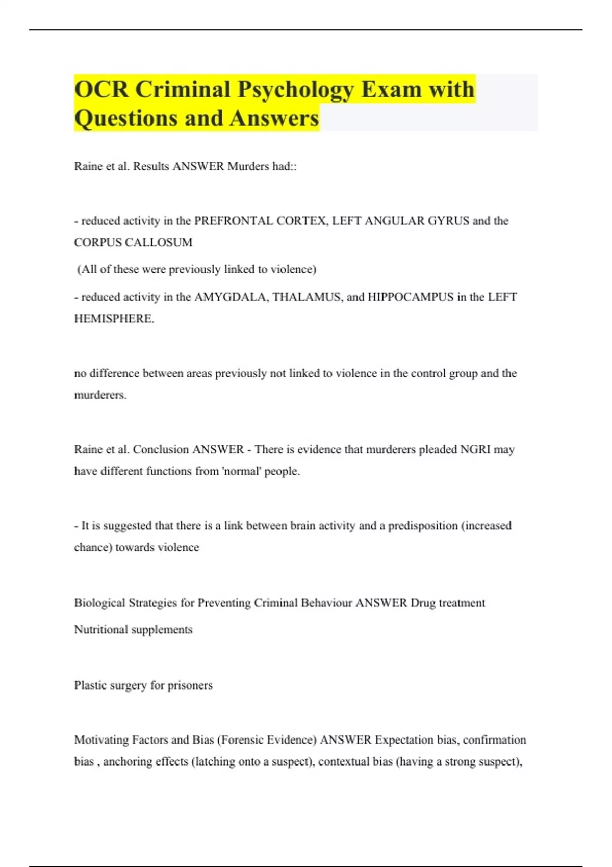 OCR Criminal Psychology Exam with Questions and Answers Raine et al. Results ANSWER Murders had:: - reduced activity in the PREFRONTAL CORTEX, LEFT ANGULAR GYRUS and the CORPUS CALLOSUM (All of these were previously linked to violence) - reduced activity in the AMYGDALA, THALAMUS, and HIPPOCAMPUS in the LEFT HEMISPHERE. no difference between areas previously not linked to violence in the control group and the murderers. Raine et al. Conclusion ANSWER - There is evidence that murderers pleaded NGRI may have different functions from 'normal' people. - It is suggested that there is a link between brain activity and a predisposition (increased chance) towards violence Biological Strategies for Preventing Criminal Behaviour ANSWER Drug treatment Nutritional supplements Plastic surgery for prisoners Motivating Factors and Bias (Forensic Evidence) ANSWER Expectation bias, confirmation bias , anchoring effects (latching onto a suspect), contextual bias (having a strong suspect),