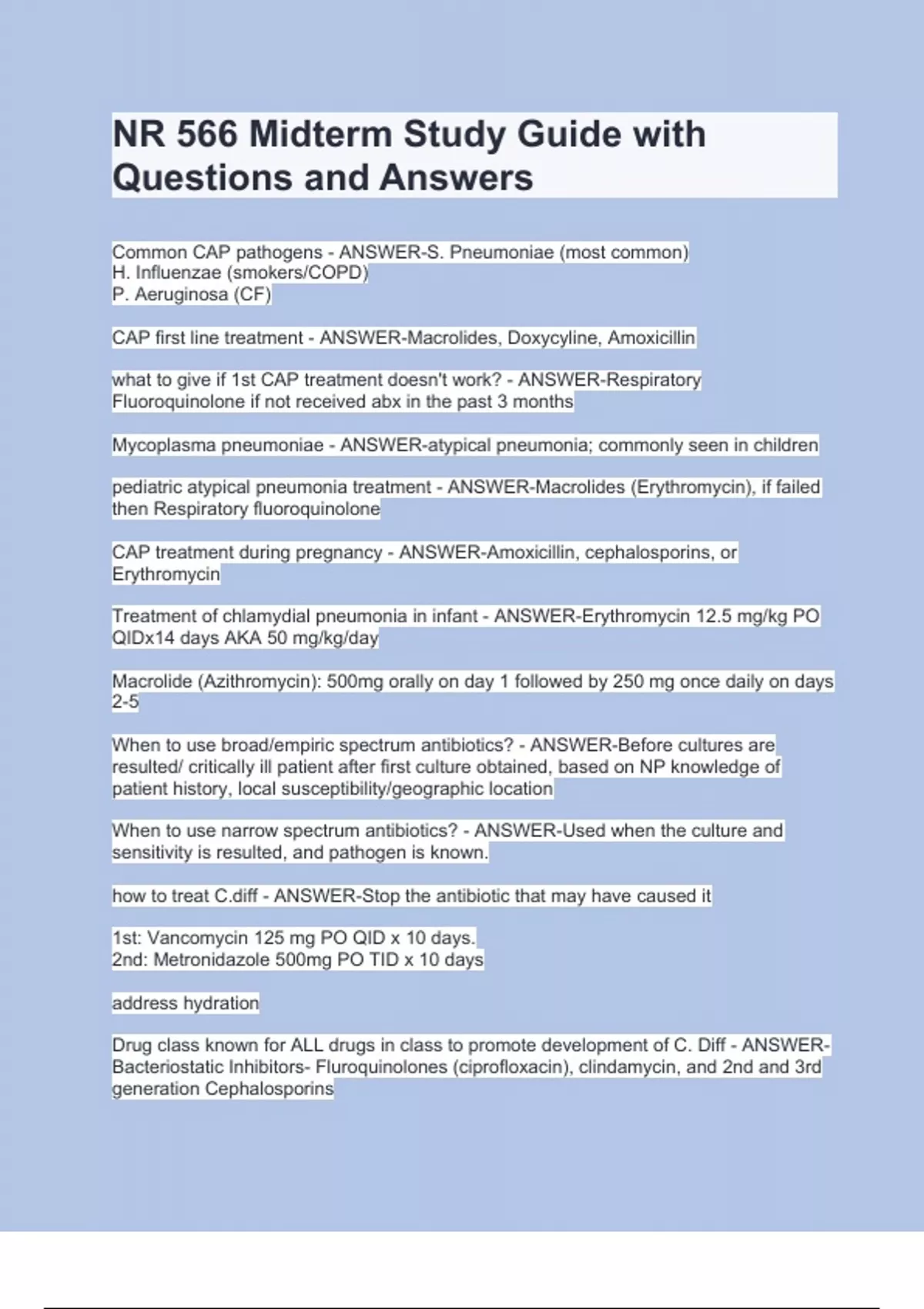 NR 566 Midterm Study Guide with Questions and AnswersNR 566 Midterm Study Guide with Questions and AnswersNR 566 Midterm Study Guide with Questions and Answers Common CAP pathogens - ANSWER-S. Pneumoniae (most common) H. Influenzae (smokers/COPD) P. Aeruginosa (CF) CAP first line treatment - ANSWER-Macrolides, Doxycyline, Amoxicillin what to give if 1st CAP treatment doesn't work? - ANSWER-Respiratory Fluoroquinolone if not received abx in the past 3 months Mycoplasma pneumoniae - ANSWER-atypical pneumonia; commonly seen in children