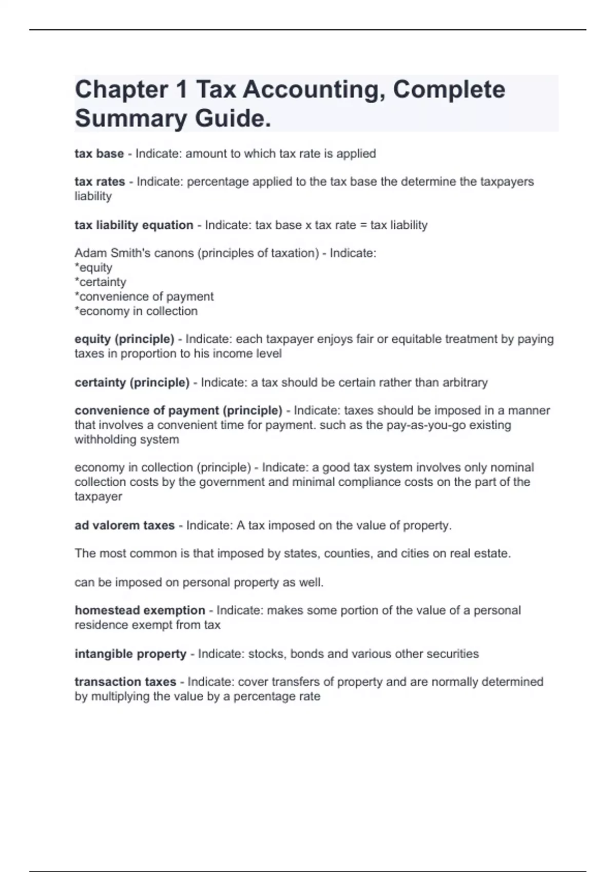 Chapter 1 Tax Accounting, Complete Summary Guide. tax base - Indicate: amount to which tax rate is applied tax rates - Indicate: percentage applied to the tax base the determine the taxpayers liability tax liability equation - Indicate: tax base x tax rate = tax liability Adam Smith's canons (principles of taxation) - Indicate: *equity *certainty *convenience of payment *economy in collection equity (principle) - Indicate: each taxpayer enjoys fair or equitable treatment by paying taxes in proportion to his income level certainty (principle) - Indicate: a tax should be certain rather than arbitrary convenience of payment (principle) - Indicate: taxes should be imposed in a manner that involves a convenient time for payment. such as the pay-as-you-go existing withholding system economy in collection (principle) - Indicate: a good tax system involves only nominal collection costs by the government and minimal compliance costs on the part of the taxpayer ad valorem taxes - Indicate: A tax imposed on the value of property. The most common is that imposed by states, counties, and cities on real estate. can be imposed on personal property as well. homestead exemption - Indicate: makes some portion of the value of a personal residence exempt from tax intangible property - Indicate: stocks, bonds and various other securities transaction taxes - Indicate: cover transfers of property and are normally determined by multiplying the value by a percentage rate