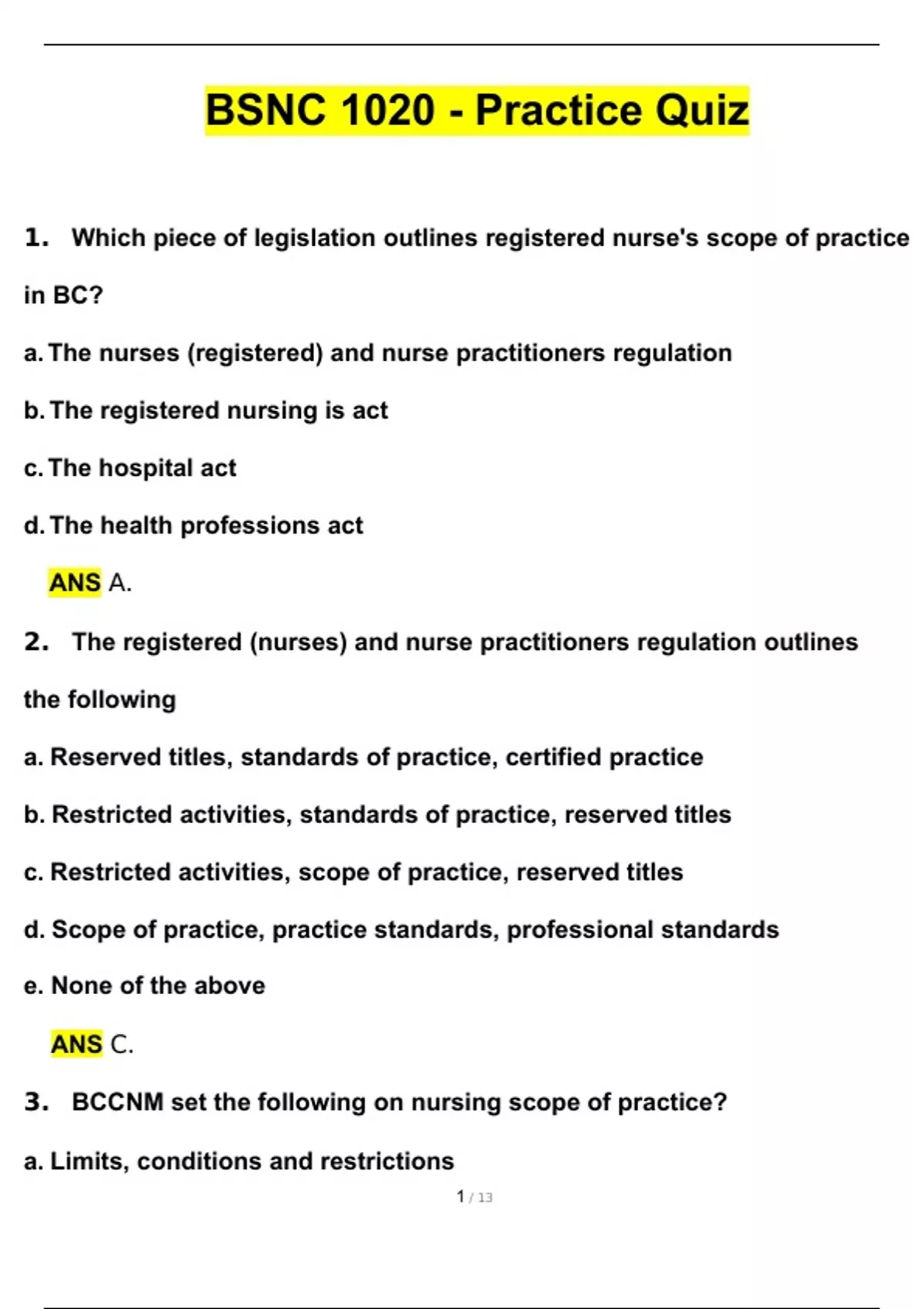 BSNC 1020 Practice Questions and Answers (2024 / 2025) (Verified Answers)