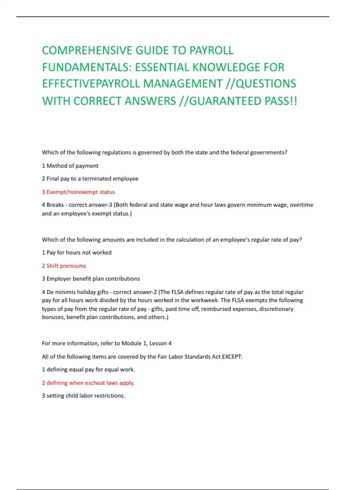 COMPREHENSIVE GUIDE TO PAYROLL FUNDAMENTALS: ESSENTIAL KNOWLEDGE FOR EFFECTIVEPAYROLL MANAGEMENT //QUESTIONS WITH CORRECT ANSWERS //GUARANTEED PASS!! Which of the following regulations is governed by both the state and the federal governments? 1 Method of payment 2 Final pay to a terminated employee 3 Exempt/nonexempt status 4 Breaks - correct answer-3 (Both federal and state wage and hour laws govern minimum wage, overtime and an employee's exempt status.) Which of the following amounts are included in the calculation of an employee's regular rate of pay? 1 Pay for hours not worked 2 Shift premiums 3 Employer benefit plan contributions 4 De minimis holiday gifts - correct answer-2 (The FLSA defines regular rate of pay as the total regular pay for all hours work divided by the hours worked in the workweek. The FLSA exempts the following types of pay from the regular rate of pay - gifts, paid time off, reimbursed expenses, discretionary bonuses, benefit plan contributions, and others.) For more information, refer to Module 1, Lesson 4 All of the following items are covered by the Fair Labor Standards Act EXCEPT: 1 defining equal pay for equal work. 2 defining when escheat laws apply. 3 setting child labor restrictions. 4 setting the minimum age for work. - correct answer-2 (The FLSA regulates overtime, minimum wage, child labor, and equal pay.) For more information, refer to Module 1, Lesson 4 Under the FLSA, an employee under the age of 20 can be paid the opportunity wage for a maximum of: 1. 30 calendar days. 2. 60 calendar days. 3. 90 calendar days. 4. 120 calendar days. - correct answer-3 (Under the FLSA, an employee under the age of 20 can be paid the opportunity wage of $4.25 per hour for a maximum of 90 calendar days.) RATIONALE For more information, refer to Module 1, Lesson 4 Under the FLSA, when a nonexempt employee receives a retroactive pay increase, over what period of time, if any, will the new pay rate impact the employee's overtime premium? 1 The entire period of the retroactive increase 2. Only the current workweek 3. Only the current pay period 4. It does not have to be considered in the overtime premium - correct answer-1 (Under the FLSA, when a nonexempt employee receives a retroactive pay increase, the new pay rate impacts the employee's overtime premium for the entire period of the retroactive increase.) SSN stands for - correct answer-Social Security Number What does an I-9 Form stands for? - correct answer-The Employment Eligibility Verification Form What is the Employement Eligibility Verication Form code? - correct answer-I-9 What does the Employment Verification Form do? - correct answer-This proves that the employee can work in the United States.