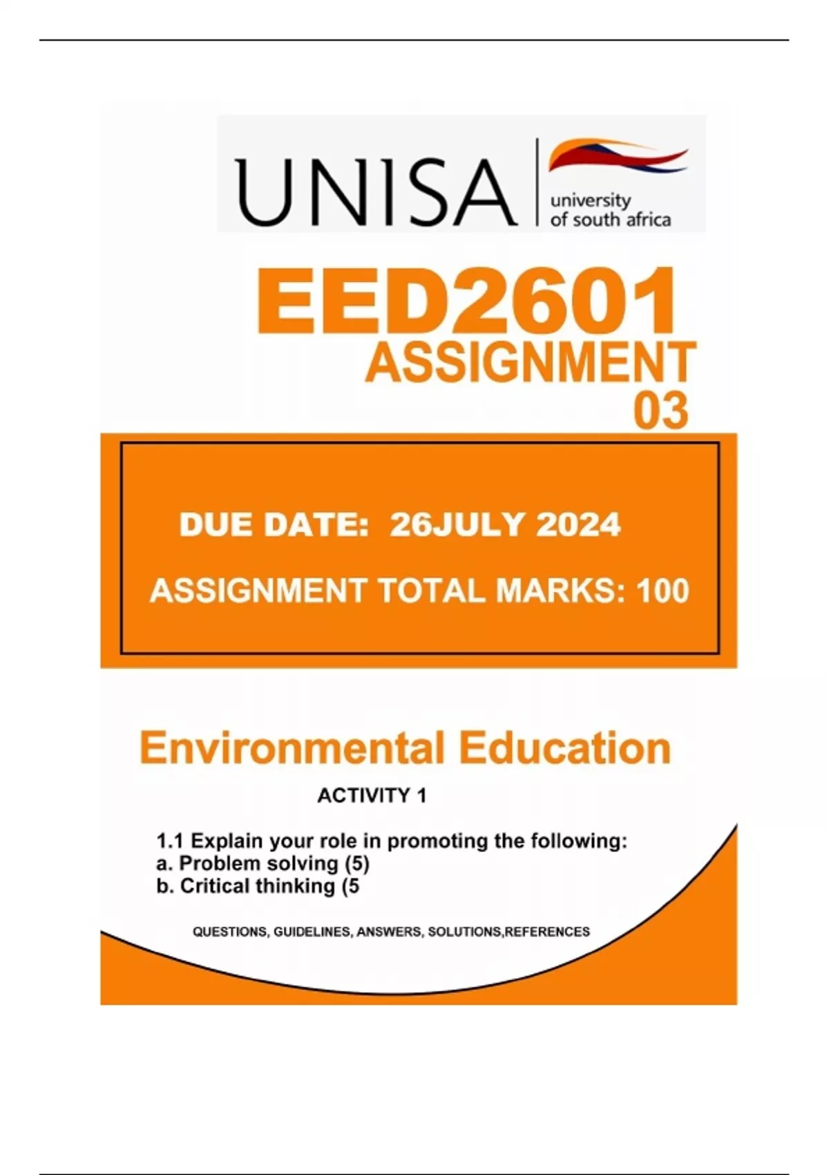 EED2601 ASSIGNMENT 03....DUE DATE 26JULY 2024 1.1 Explain your role in promoting the following: a. Problem solving (5) ..... b. Critical thinking (5) .....Mention any five environmental education methods and discuss how you will apply them in teaching an environmental education topic of your choice. Taking into consideration the following aspects: The grade, subject and the environmental education topic as per Curriculum Assessment Policy Statement (CAPS) document. Attach 1 page or the picture of the chosen topic from CAPS document as evidence.