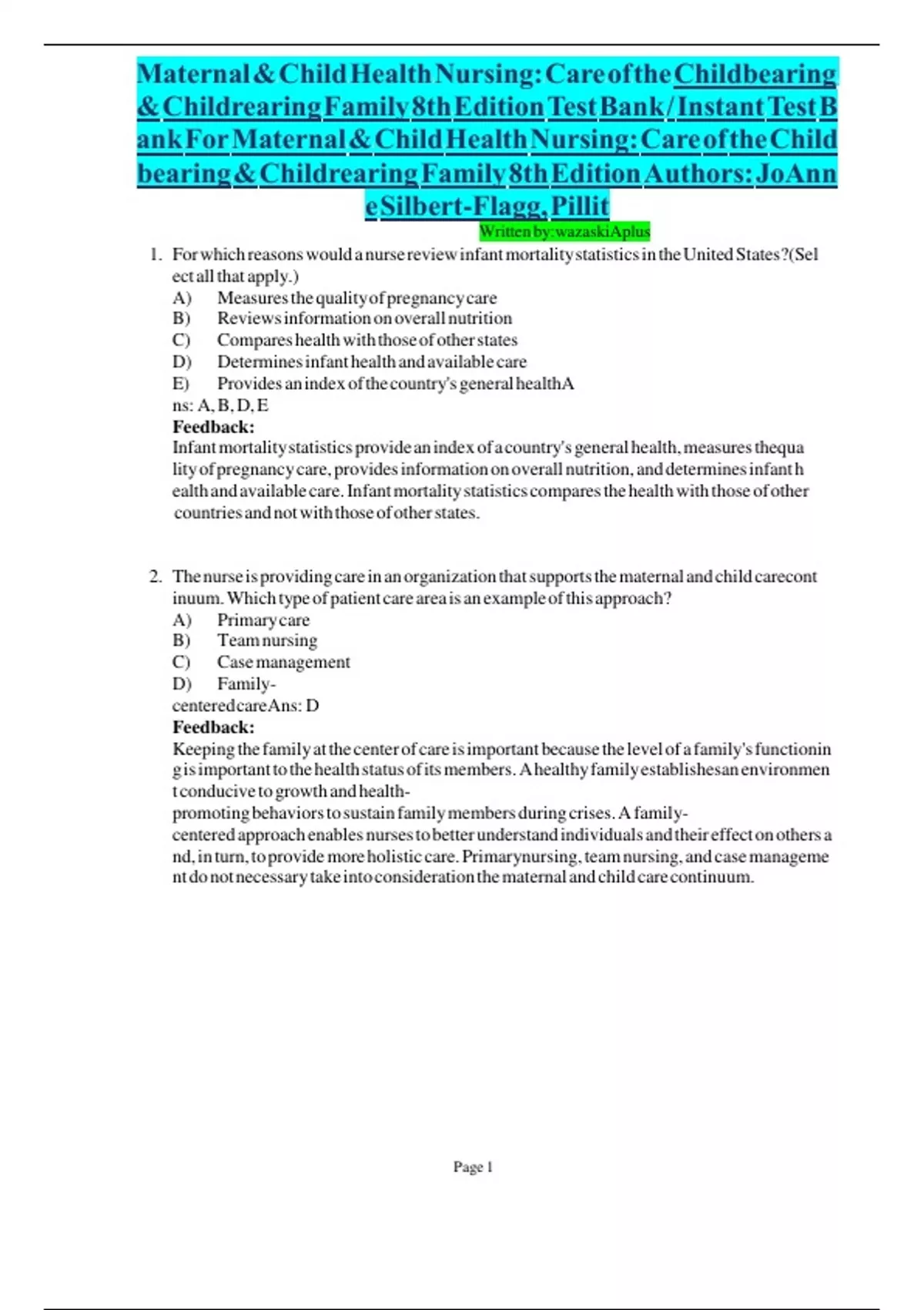 Test Bank For Maternal & Child Health Nursing: Care of the Childbearing & Childrearing Family 8th Edition Silbert Flagg All Chapters (1-56) |A+ ULTIMATE GUIDE 2024