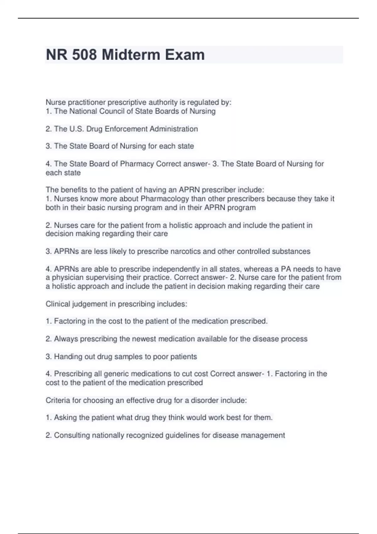 NR 508 MIDTERM EXAM 2 NR 508 Midterm Exam Nurse practitioner prescriptive authority is regulated by: 1. The National Council of State Boards of Nursing 2. The U.S. Drug Enforcement Administration 3. The State Board of Nursing for each state 4. The State Board of Pharmacy Correct answer- 3. The State Board of Nursing for each state The benefits to the patient of having an APRN prescriber include: 1. Nurses know more about Pharmacology than other prescribers because they take it both in their basic nursing program and in their APRN program 2. Nurses care for the patient from a holistic approach and include the patient in decision making regarding their care 3. APRNs are less likely to prescribe narcotics and other controlled substances 4. APRNs are able to prescribe independently in all states, whereas a PA needs to have a physician supervising their practice. Correct answer- 2. Nurse care for the patient from a holistic approach and include the patient in decision making regarding their care Clinical judgement in prescribing includes: 1. Factoring in the cost to the patient of the medication prescribed. 2. Always prescribing the newest medication available for the disease process 3. Handing out drug samples to poor patients 4. Prescribing all generic medications to cut cost Correct answer- 1. Factoring in the cost to the patient of the medication prescribed Criteria for choosing an effective drug for a disorder include: 1. Asking the patient what drug they think would work best for them.