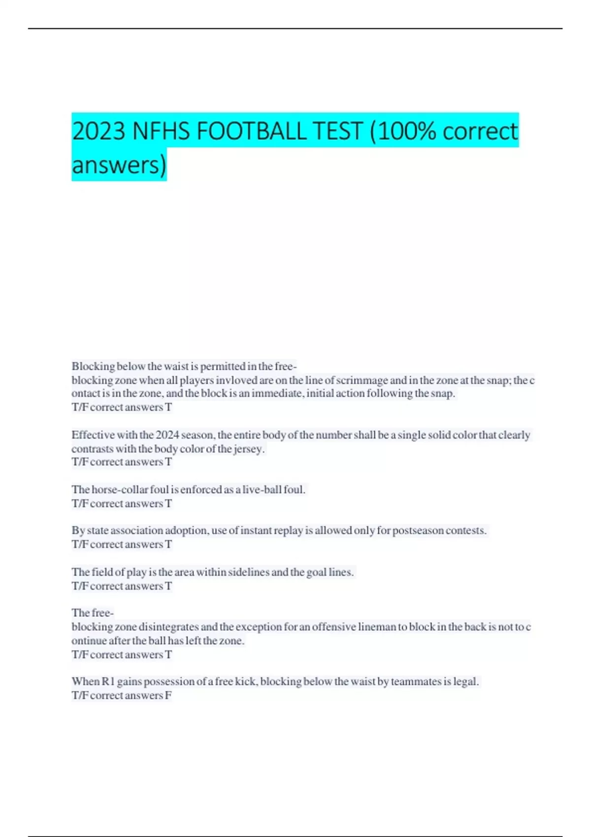 contrasts fwith fthe fbody fcolor fof fthe fjersey. f T/F fcorrect fanswers fT The fhorse -collar ffoul fisfenforced fas faflive-ball ffoul. f T/F fcorrect fanswers fT By fstate fassociation fadoption, fuse fof finstant freplay fisfallowed fonly ffor fpostseason fcontests. f T/F fcorrect fanswers fT The ffield fof fplay fisfthe farea fwithin fsidelines fand fthe fgoal flines. f T/F fcorrect fanswers fT The ffree-