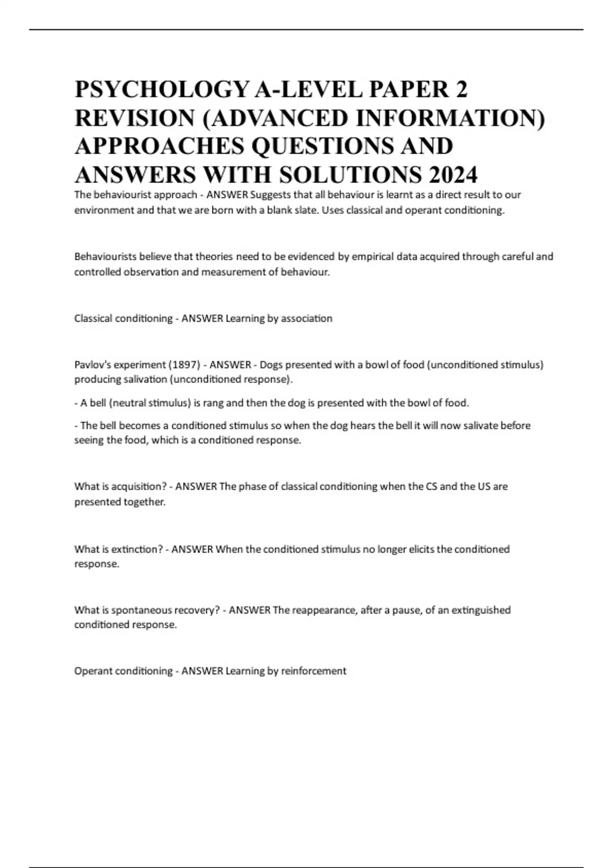 PSYCHOLOGY A-LEVEL PAPER 2 REVISION (ADVANCED INFORMATION) APPROACHES QUESTIONS AND ANSWERS WITH SOLUTIONS 2024
