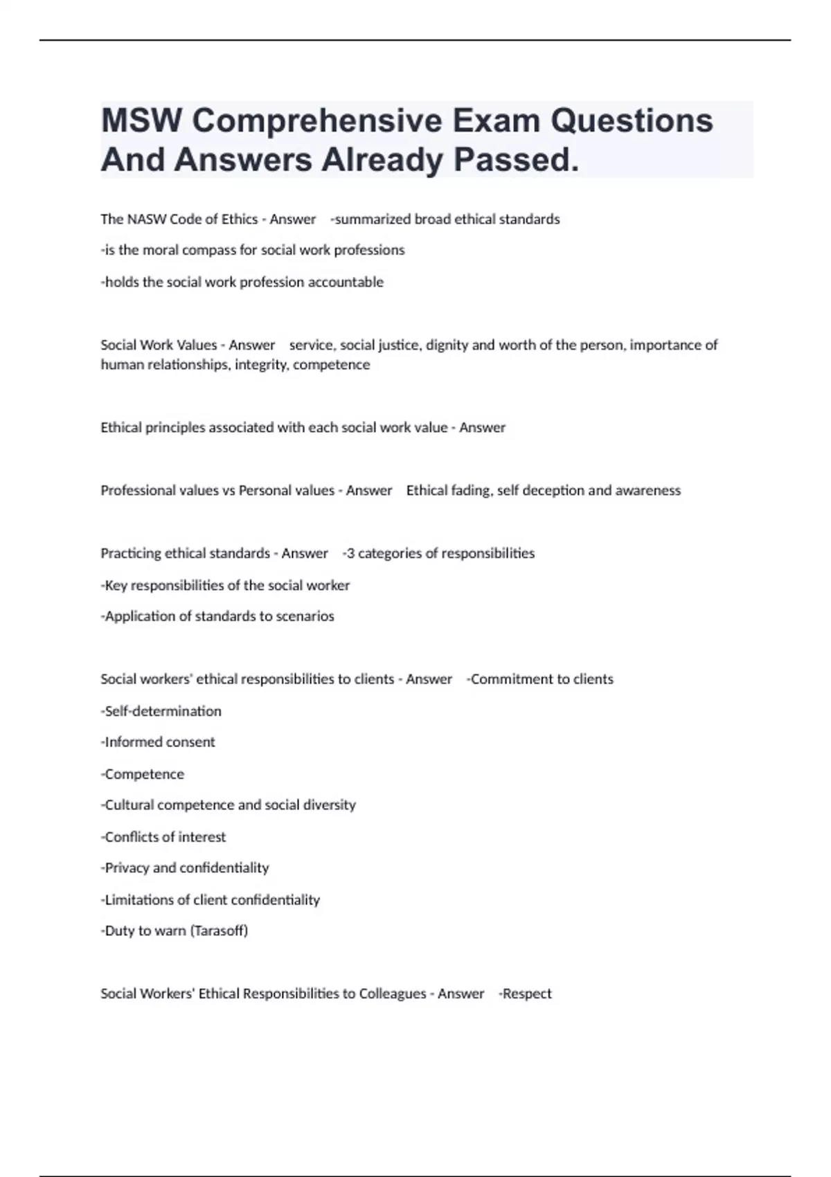 MSW Comprehensive Exam Questions And Answers Already Passed.