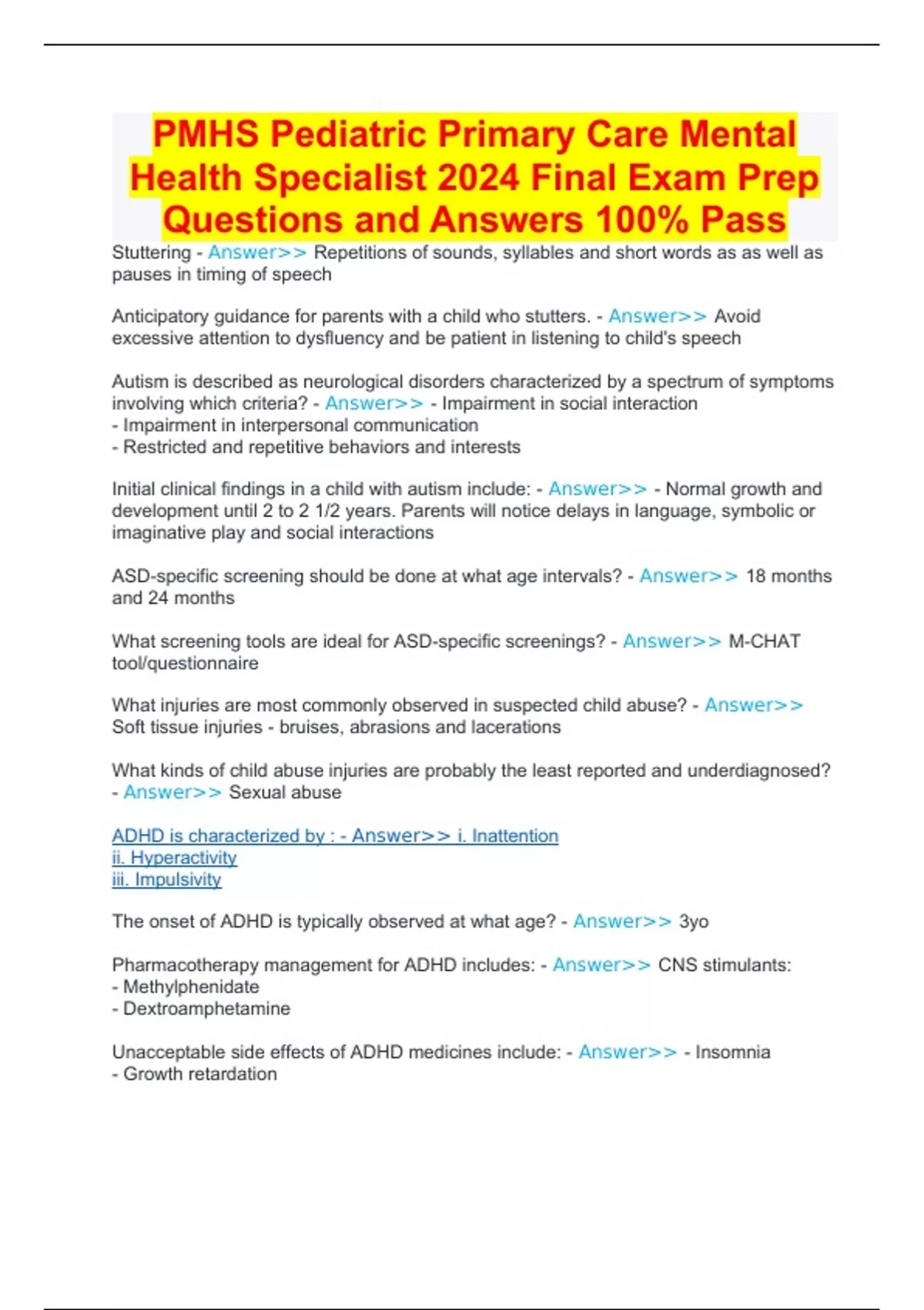 PMHS Pediatric Primary Care Mental Health Specialist 2024 Final Exam Prep Questions and Answers 100% Pass
