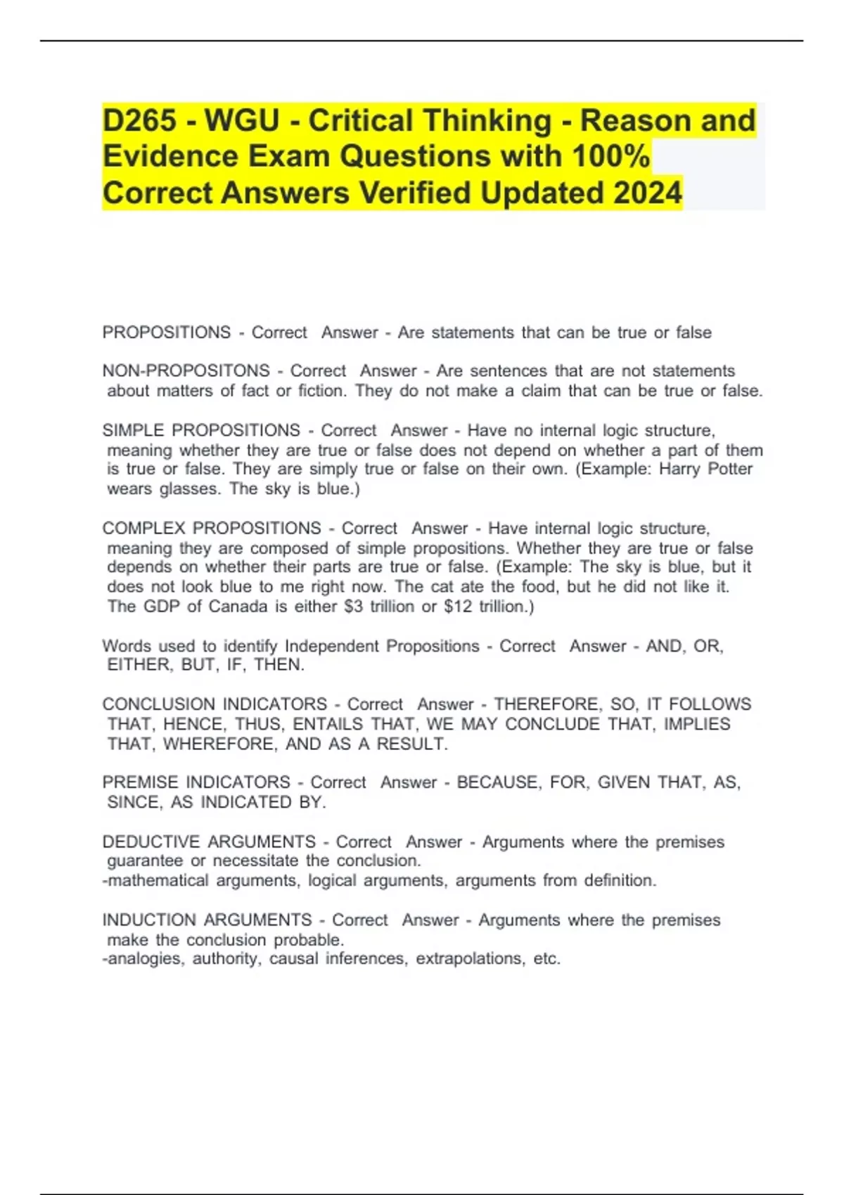 D265 - WGU - Critical Thinking - Reason and Evidence Exam Questions with 100- Correct Answers Verified Updated 2024.docx