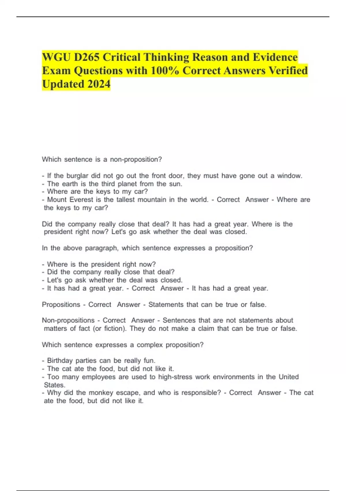 WGU D265 Critical Thinking Reason and Evidence Exam Questions with 100% Correct Answers Verified Updated 2024