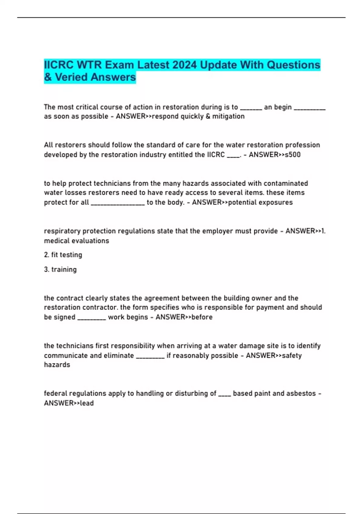 IICRC WTR Exam Latest 2024 Update With Questions & Veried Answers The most critical course of action in restoration during is to _______ an begin __________ as soon as possible - ANSWER>>respond quickly & mitigation All restorers should follow the standard of care for the water restoration profession developed by the restoration industry entitled the IICRC ____. - ANSWER>>s500 to help protect technicians from the many hazards associated with contaminated water losses restorers need to have ready access to several items. these items protect for all _________________ to the body. - ANSWER>>potential exposures respiratory protection regulations state that the employer must provide - ANSWER>>1. medical evaluations 2. fit testing 3. training the contract clearly states the agreement between the building owner and the restoration contractor. the form specifies who is responsible for payment and should be signed _________ work begins - ANSWER>>before the technicians first responsibility when arriving at a water damage site is to identify communicate and eliminate _________ if reasonably possible - ANSWER>>safety hazards federal regulations apply to handling or disturbing of ____ based paint and asbestos - ANSWER>>lead After safety concerns have been addressed and the initial water source has been stopped, the restorer must complete an evaluation of the water's migration through the structure. During this process, the restorer inspects all ___________ ________ areas. - ANSWER>>potentially affected the ultimate goal is to find the edge of water migration which moves in a three dimensional path throughout the structure. this is accomplished across carpeted surfaces using a _____ and across most hard surfaces using a _____ (non-penetrating) moisture meter. - ANSWER>>moisture sensor , non-invasive water from a clean source with no substantial risk of causing sickness or discomfort is said to be - ANSWER>>category 1 water that has significant degree of chemical biological and or physical contamination and potential to cause sickness or discomfort is ___________ - ANSWER>>category 2 cleaning procedures must be employed before the drying of a category 2 water loss can continue. at a minimum affected __________ must be removed and disposed of and carpet must be throughly cleaned using a hot water extraction method. - ANSWER>>carpet underlay When water intrusion results from a grossly unsanitary source or carries __________ (disease causing) agents, it is said to be Category 3. - ANSWER>>pathogenic worker and occupant ______ and safety are the 1st priority on every sewage loss. areas affected by category 3 water intrusion are marked and posted as potentially hazardous. - ANSWER>>health Various cleaning and decontamination procedures must be used on Category 3 water losses, including the removal of all ______ ______ materials affected by the water intrusion. - ANSWER>>highly porous when resistance is encountered and performing proper services in a category 3 water loss becomes a challenge restorers _____________ immediately to prevent liability and address the conflict. - ANSWER>>stop work Third party experts are commonly referred to as Indoor Environmental Professionals, or ____. - ANSWER>>IEP Losses where regulated or hazardous materials have contaminated the structure do not change the _______ of water. - ANSWER>>category pre-existing conditions should be identified documented and communicated to all _________ parties during the initial inspection. - ANSWER>>materially interested when carpet delimitation (the loss of integrity in the adhesives used to laminate the _____ and _____ backings) has occurred, further damage is very likely. for this reason when extensive carpet delimitation is discovered technicians must call it to the attention go all materially interested parties , document the condition and suggest replacement. - ANSWER>>primary and secondary there are number of causes for carpet delimitation - many of them relates to ____ restoration activities - ANSWER>>improper Many building materials will absorb excess water vapor and suffer damage, especially when air is allowed to remain above __% relative humidity. - ANSWER>>60% Hygroscopic materials gain and lose moisture continually in an effort to ________ with the water content in the surrounding air mass. The more hygroscopic the material, the faster it will collect water vapor, and the easier it will suffer _________ damage. - ANSWER>>equalize and secondary When water intrusion results in water running through wall cavities, inspection access holes are used to ensure that blown-in insulation has not compacted and lost its ______. Wet compressed insulation should be ______ - ANSWER>>R-Value , removed