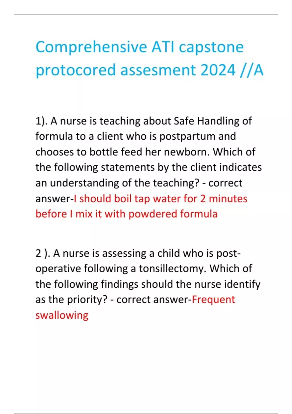 Comprehensive ATI capstone proctored assessment 2024 //A 1). A nurse is teaching about Safe Handling of formula to a client who is postpartum and chooses to bottle feed her newborn. Which of the following statements by the client indicates an understanding of the teaching? - correct answer-I should boil tap water for 2 minutes before I mix it with powdered formula 2 ). A nurse is assessing a child who is postoperative following a tonsillectomy. Which of the following findings should the nurse identify as the priority? - correct answer-Frequent swallowing 3). A nurse is teaching a client who is pregnant about non-stress testing. Which of the following statements by the client indicates an understanding of the teaching? - correct answer-During this test, I will punch a button if the baby moves 4). A nurse is teaching a client who has a new prescription for metformin extended release tablets. Which of the following statements by the client indicates an understanding of the teaching? - correct answer-I will avoid crushing this medication 5). A nurse is assessing a client who is receiving enteral feeding via an NG tube. The client has developed hyperosmolar dehydration. Which of the following actions should the nurse take when administering the client's findings? - 1). A nurse is teaching about Safe Handling of formula to a client who is postpartum and chooses to bottle feed her newborn. Which of the following statements by the client indicates an understanding of the teaching? - correct answer-I should boil tap water for 2 minutes before I mix it with powdered formula 2 ). A nurse is assessing a child who is postoperative following a tonsillectomy. Which of the following findings should the nurse identify as the priority? - correct answer-Frequent swallowing 3). A nurse is teaching a client who is pregnant about non-stress testing. Which of the following statements by the client indicates an understanding of the teaching? - correct answer-During this test, I will punch a button if the baby moves 4). A nurse is teaching a client who has a new prescription for metformin extended release tablets. Which of the following statements by the client indicates an understanding of the teaching? - correct answer-I will avoid crushing this medication 5). A nurse is assessing a client who is receiving enteral feeding via an NG tube. The client has developed hyperosmolar dehydration. Which of the following actions should the nurse take when administering the client's findings? - 1). A nurse is teaching about Safe Handling of formula to a client who is postpartum and chooses to bottle feed her newborn. Which of the following statements by the client indicates an understanding of the teaching? - correct answer-I should boil tap water for 2 minutes before I mix it with powdered formula 2 ). A nurse is assessing a child who is postoperative following a tonsillectomy. Which of the following findings should the nurse identify as the priority? - correct answer-Frequent swallowing 3). A nurse is teaching a client who is pregnant about non-stress testing. Which of the following statements by the client indicates an understanding of the teaching? - correct answer-During this test, I will punch a button if the baby moves 4). A nurse is teaching a client who has a new prescription for metformin extended release tablets. Which of the following statements by the client indicates an understanding of the teaching? - correct answer-I will avoid crushing this medication 5). A nurse is assessing a client who is receiving enteral feeding via an NG tube. The client has developed hyperosmolar dehydration. Which of the following actions should the nurse take when administering the client's findings? -