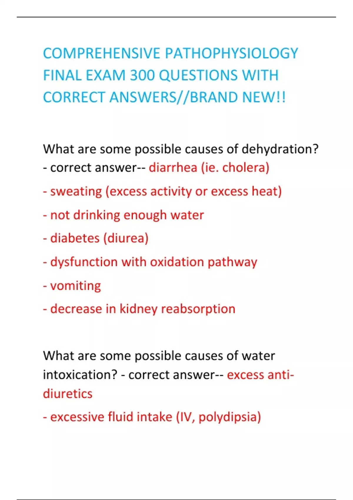 COMPREHENSIVE PATHOPHYSIOLOGY FINAL EXAM 300 QUESTIONS WITH CORRECT ANSWERS//BRAND NEW!! What are some possible causes of dehydration? - correct answer-- diarrhea (ie. cholera) - sweating (excess activity or excess heat) - not drinking enough water - diabetes (diurea) - dysfunction with oxidation pathway - vomiting - decrease in kidney reabsorption What are some possible causes of water intoxication? - correct answer-- excess antidiuretics - excessive fluid intake (IV, polydipsia) - decreased kidney function (decreased urine output) - problems sweating What is the total body water in males? females? - correct answer-60% and 55% What factors can affect water intake and output? - correct answer-temperature and activity What are the main sources of water intake? - correct answer-- drinking - food - oxidation from burning carbon fuels What are the main sources of water output? - correct answer-- urine - insensible water from skin/lungs - sweat - stool What is the anion gap? - correct answer-- difference between the sum of measured cations and measured anions - ([Na]+[K])-([Cl]+[HCO3]) What would a high anion gap indicate? - correct answer-- elevated levels of unmeasured anions - lactic acidosis - ketoacidosis What are some possible causes of dehydration? - correct answer-- diarrhea (ie. cholera) - sweating (excess activity or excess heat) - not drinking enough water - diabetes (diurea) - dysfunction with oxidation pathway - vomiting - decrease in kidney reabsorption What are some possible causes of water intoxication? - correct answer-- excess antidiuretics - excessive fluid intake (IV, polydipsia) - decreased kidney function (decreased urine output) - problems sweating What is the total body water in males? females? - correct answer-60% and 55% What factors can affect water intake and output? - correct answer-temperature and activity What are the main sources of water intake? - correct answer-- drinking - food - oxidation from burning carbon fuels What are the main sources of water output? - correct answer-- urine - insensible water from skin/lungs - sweat - stool What is the anion gap? - correct answer-- difference between the sum of measured cations and measured anions - ([Na]+[K])-([Cl]+[HCO3]) What would a high anion gap indicate? - correct answer-- elevated levels of unmeasured anions - lactic acidosis - ketoacidosis