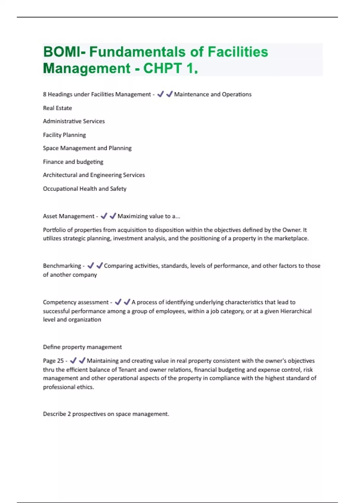 8 Headings under Facilities Management - Maintenance and Operations Real Estate Administrative Services Facility Planning Space Management and Planning Finance and budgeting Architectural and Engineering Services Occupational Health and Safety Asset Management - Maximizing value to a... Portfolio of properties from acquisition to disposition within the objectives defined by the Owner. It utilizes strategic planning, investment analysis, and the positioning of a property in the marketplace. Benchmarking - Comparing activities, standards, levels of performance, and other factors to those of another company Competency assessment - A process of identifying underlying characteristics that lead to successful performance among a group of employees, within a job category, or at a given Hierarchical level and organization Define property management Page 25 - Maintaining and creating value in real property consistent with the owner's objectives thru the efficient balance of Tenant and owner relations, financial budgeting and expense control, risk management and other operational aspects of the property in compliance with the highest standard of professional ethics. Describe 2 prospectives on space management.Pages 28/29 - Inside out view... The FM looks from inside the business out to the external environment of economic forces, the marketplace, and corporate competition thru the eyes of a manager of a given business. Fac Mgmt plays an important role in integrating employees, work processes, and workplaces into a coherent and productive system. These elements ID by Fac Mgmt Institute are: - People - end users, vendors, visitors, who utilize the space. Process - all work processes that occur in the space, namely pedestrian and vehicular movement, work, and paper flow. Place - physical infrastructure of a building and how it supports employees work. Physical infrastructure includes the land and site; individual buildings; occupant or tenant spaces, with their individual workstations and offices; production, fabrication, and execution areas, such as those found in industry; and utilities, energy, and telecommunications equipment. Facilities management responsibilities such as evaluating the effectiveness of service, benchmarking, management of audits, and development of innovative improvements are all part of what function? - They are all an essential part of facility management that must be handled diligently Facility Management Dev by BOMI - coordinates the physical workplace with the people and work of an organization. The primary function of facility management is to plan, establish and maintain a work environment that effectively supports the goals and objectives of the organization. Facility Management - integrates the principles of business administration, planning and design, architecture, and behavioral and engineering sciences. General Principles that have become the focus of Facility Management - Integration of people, process, and place Work environments impact on productivity Defining client: internal/external customers Customer service and quality New management work styles Relationship to corp. business strategy/plngIssues of project control and management Financial performance Fac Mgmt as a profession and business Fac Mgmt as a process How can a facility manager best improve worker productivity? Page 9 and 10 - Fostering better human performance by providing the environment and tools that people need to work effectively and efficiently. How can facility management successfully affect the corporate mission? Page 22 - ? In most companies how our facility departments viewed? Page 20 - They are viewed as overhead because they do not generate sales and revenue as profit centers do Turn rate - The one year rate of a physical reconfiguration of workspace caused by work or transfer, including furniture partition, cable, and telephone relocations; usually expressed as a percentage of total workspace area involved in reconfiguration What are the three dimensions of quality? Page 12 - Input - understanding the customers needs and expectations. Process - taking action to meet/exceed those needs/expectations. Output - following up to determine if the action was appropriate and if customer is satisfied. What do you facilities managers engage in to anticipate and respond appropriately to current and future business trends? Page 17 - Strategic planning What is the best way for A facility manager to become more proactive and avoid crisis management? Page 9 - They should participate in their company's discussions of corporate management issuesWhat is the most expensive element of most office and other white collar work places? Page 22 - People What percent of a company's capital assets does the average facility department manage? Page 15 - 25% What professional aspect of facility management distinguishes it from related professions? - Coordination and integration across traditionally separate disciplinary lines make a professional aspects of facility management different from related professions