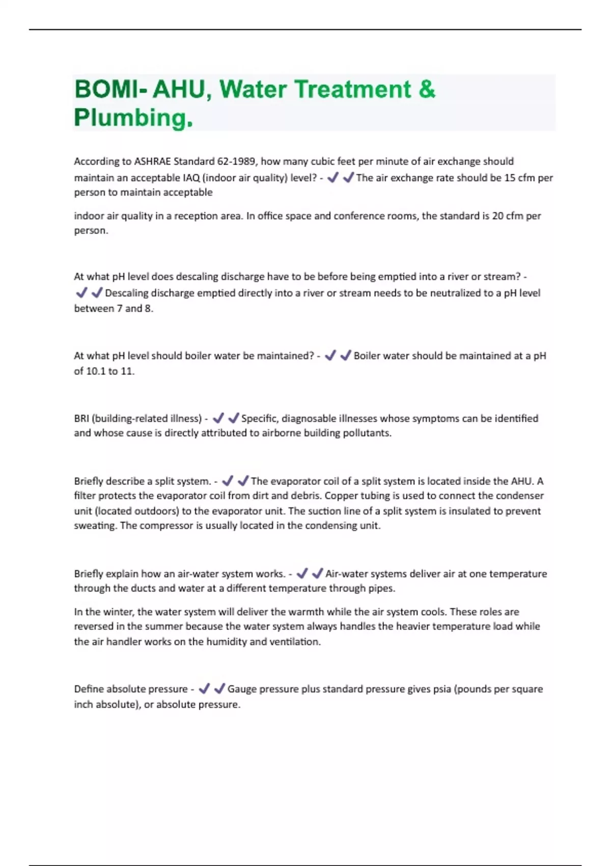 BOMI- AHU, Water Treatment & Plumbing (Questions & Answers) Rated 100% Correct!!