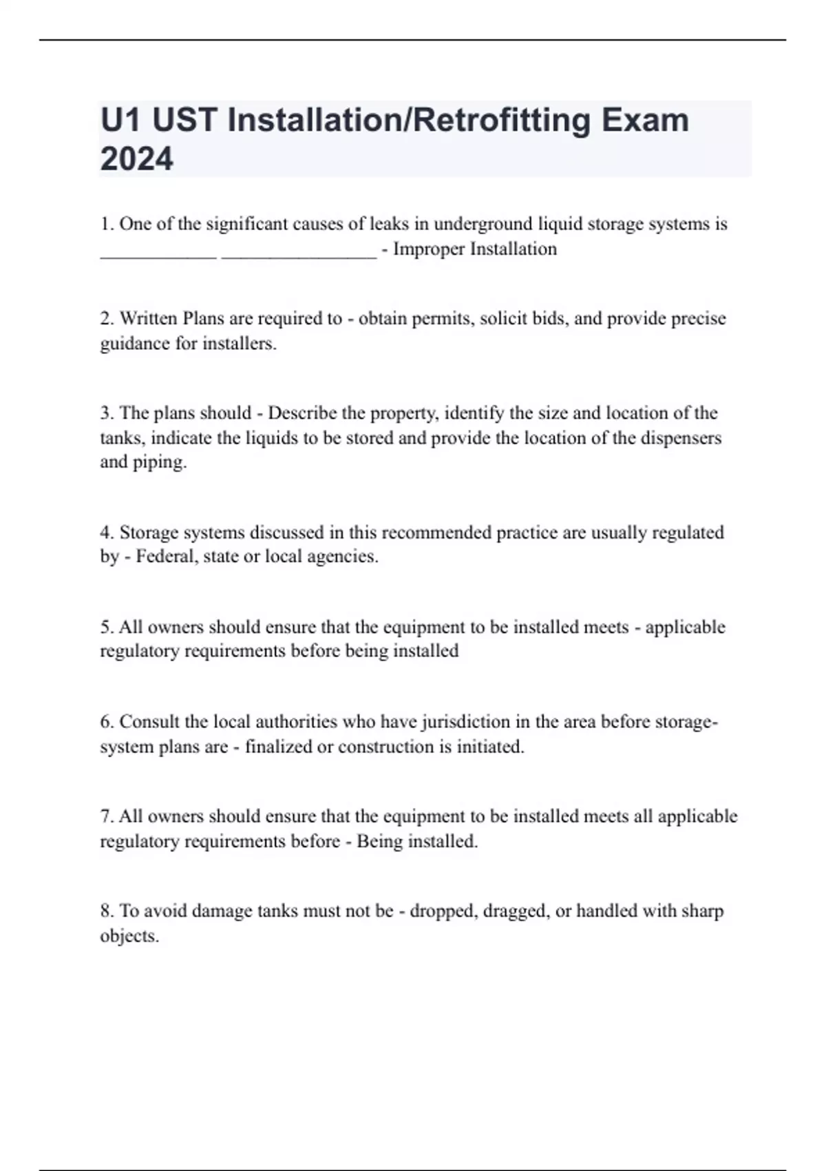 1. One of the significant causes of leaks in underground liquid storage systems is ____________ ________________ - Improper Installation 2. Written Plans are required to - obtain permits, solicit bids, and provide precise guidance for installers. 3. The plans should - Describe the property, identify the size and location of the tanks, indicate the liquids to be stored and provide the location of the dispensers and piping. 4. Storage systems discussed in this recommended practice are usually regulated by - Federal, state or local agencies. 5. All owners should ensure that the equipment to be installed meets - applicable regulatory requirements before being installed 6. Consult the local authorities who have jurisdiction in the area before storage-system plans are - finalized or construction is initiated. 7. All owners should ensure that the equipment to be installed meets all applicable regulatory requirements before - Being installed. 8. To avoid damage tanks must not be - dropped, dragged, or handled with sharp objects. 9. Tanks must not be dropped, dragged, or handled with sharp objects to avoid - Damage to the tank 10. The only time tanks really should be moved is when - for inspections and testing. 11. If a tanks is damaged at all throughout the moving process it must be - Repaired in accordance with the manufacture's instructions. 12. The proper way to move a tank is by lifting it, using the - Lift lugs that are installed by the manufacturer.