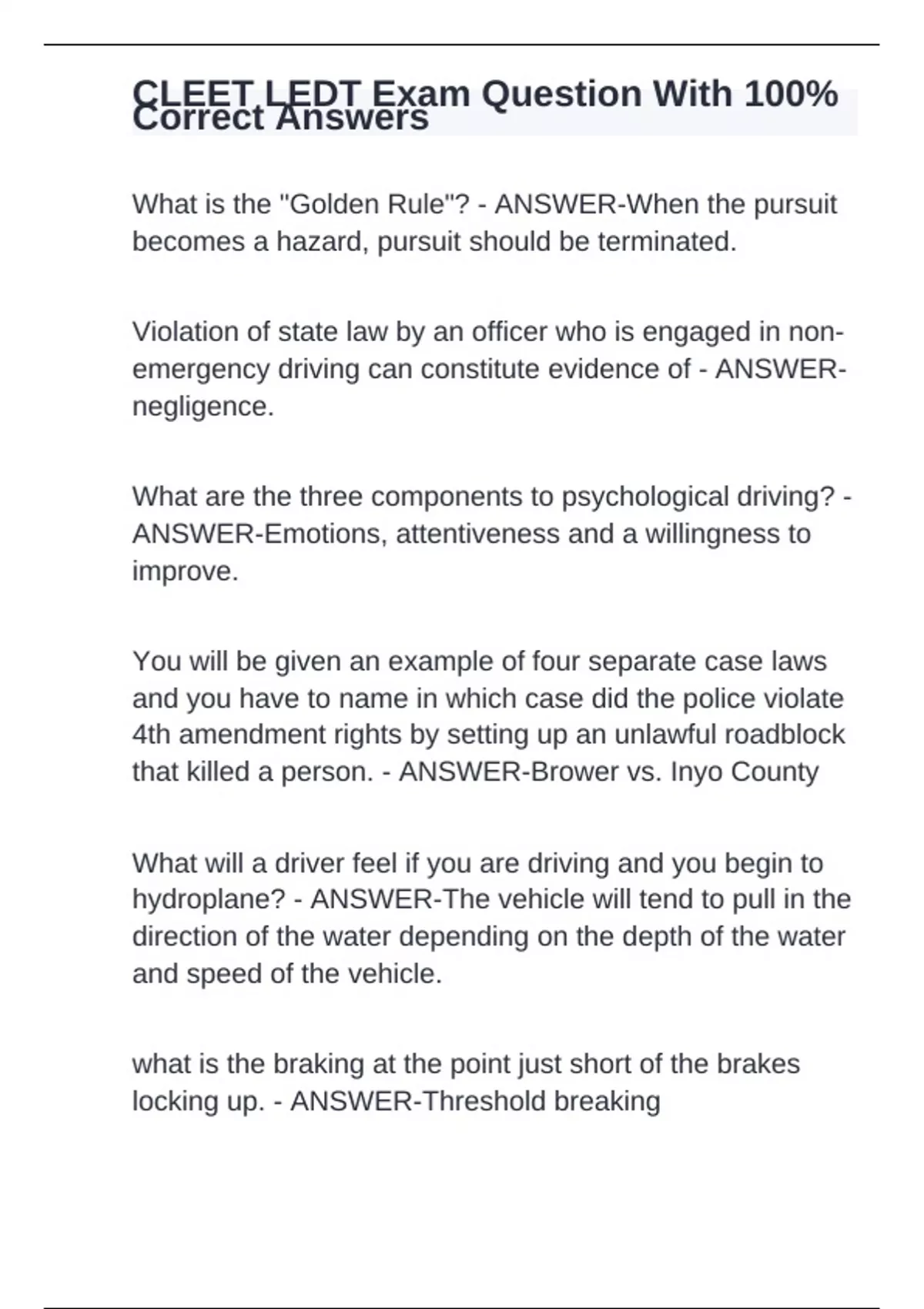 What is the "Golden Rule"? - ANSWER-When the pursuit becomes a hazard, pursuit should be terminated. Violation of state law by an officer who is engaged in non-emergency driving can constitute evidence of - ANSWER-negligence. What are the three components to psychological driving? - ANSWER-Emotions, attentiveness and a willingness to improve. You will be given an example of four separate case laws and you have to name in which case did the police violate 4th amendment rights by setting up an unlawful roadblock that killed a person. - ANSWER-Brower vs. Inyo County What will a driver feel if you are driving and you begin to hydroplane? - ANSWER-The vehicle will tend to pull in the direction of the water depending on the depth of the water and speed of the vehicle.