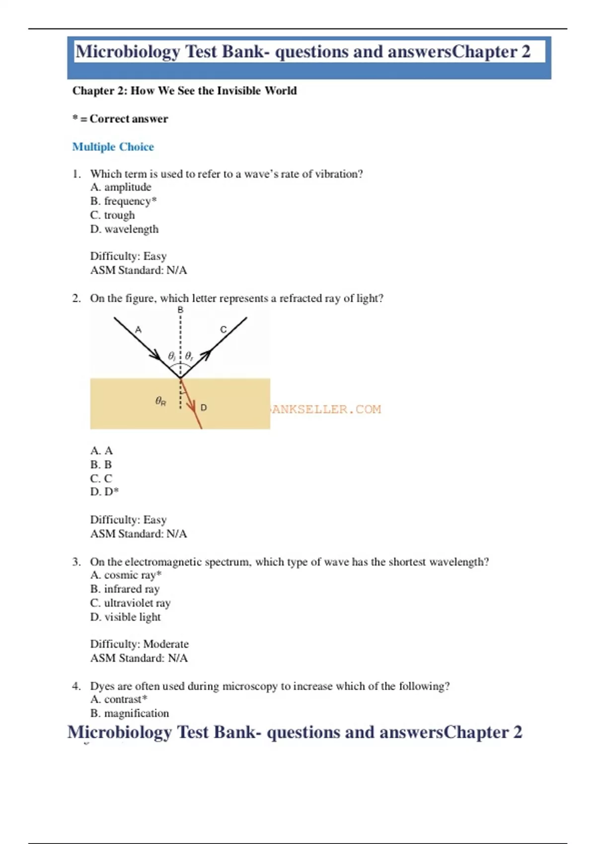 Microbiology Test Bank- questions and answersChapter 2 Microbiology Test Bank- questions and answersChapter 2 TESTB Chapter 2: How We See the Invisible World * = Correct answer Multiple Choice 1. Which term is used to refer to a wave’s rate of vibration? A. amplitude B. frequency* C. trough D. wavelength Difficulty: Easy ASM Standard: N/A 2. On the figure, which letter represents a refracted ray of light? ANKSELLER.COM A. A B. B C. C D. D* Difficulty: Easy ASM Standard: N/A 3. On the electromagnetic spectrum, which type of wave has the shortest wavelength? A. cosmic ray* B. infrared ray C. ultraviolet ray D. visible light Difficulty: Moderate ASM Standard: N/A 4. Dyes are often used during microscopy to increase which of the following? A. contrast* B. magnification Page 2 of 19 Microbiology Test Bank- questions and answersChapter 2 Microbiology Test Bank- questions and answersChapter 2 C. motility D. resolution Difficulty: Easy ASM Standard: 32 5. Which of the following was the first to use the term “cells”? A. Robert Hooke* B. Robert Koch C. Carolus Linnaeus D. Antonie van Leeuwenhoek Difficulty: Easy ASM Standard: N/A 6. Which of the following is the typical magnification of an object viewed using a 10× ocular lens and a 100× objective lens on a brightfield microscope? A. 1× B. 10× C. 100× D. 1000×* Difficulty: Moderate ASM Standard: 32 TESTBANKSELLER.COM 7. Most modern microscopes have two eyepieces, meaning that they are which of the following? A. binocular* B. monocular C. oil immersion D. trinocular Difficulty: Easy ASM Standard: 32