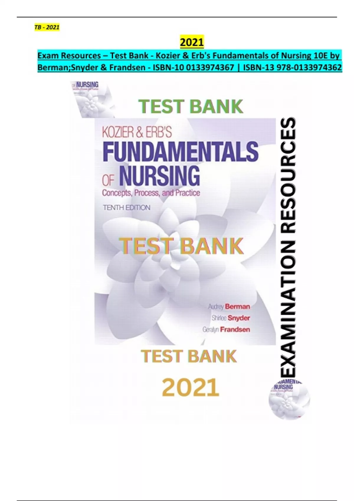 Exam Resources - TB for Kozier & Erb's Fundamentals of Nursing 10th Edition. Complete, Detailed and latest Test Bank. Chapters (1-3) Included. Full Document (Chapters 1-52) to be Downloaded on Provided Links.