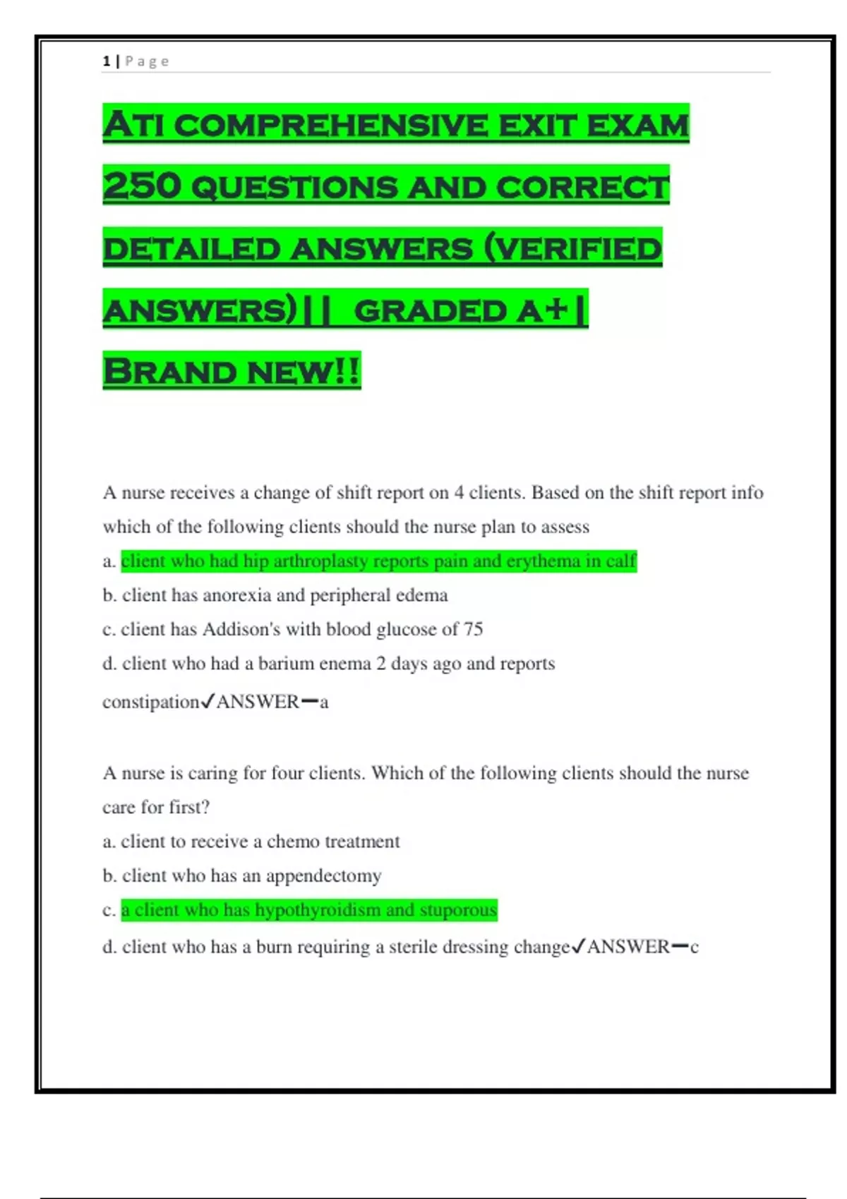 Ati comprehensive exit exam 250 questions and correct detailed answers (verified answers)|| graded a+| Brand new!! A nurse receives a change of shift report on 4 clients. Based on the shift report info which of the following clients should the nurse plan to assess a. client who had hip arthroplasty reports pain and erythema in calf b. client has anorexia and peripheral edema c. client has Addison's with blood glucose of 75 d. client who had a barium enema 2 days ago and reports constipationANSWERa A nurse is caring for four clients. Which of the following clients should the nurse care for first? a. client to receive a chemo treatment b. client who has an appendectomy c. a client who has hypothyroidism and stuporous d. client who has a burn requiring a sterile dressing changeANSWERc