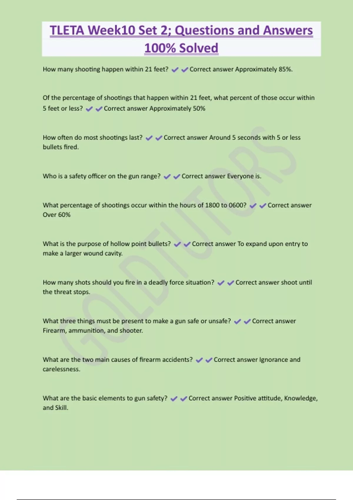 TLETA Week10 Set 2; Questions and Answers 100% Solved How many shooting happen within 21 feet? Correct answer Approximately 85%. Of the percentage of shootings that happen within 21 feet, what percent of those occur within 5 feet or less? Correct answer Approximately 50% How often do most shootings last? Correct answer Around 5 seconds with 5 or less bullets fired. Who is a safety officer on the gun range? Correct answer Everyone is. What percentage of shootings occur within the hours of 1800 to 0600? Correct answer Over 60%