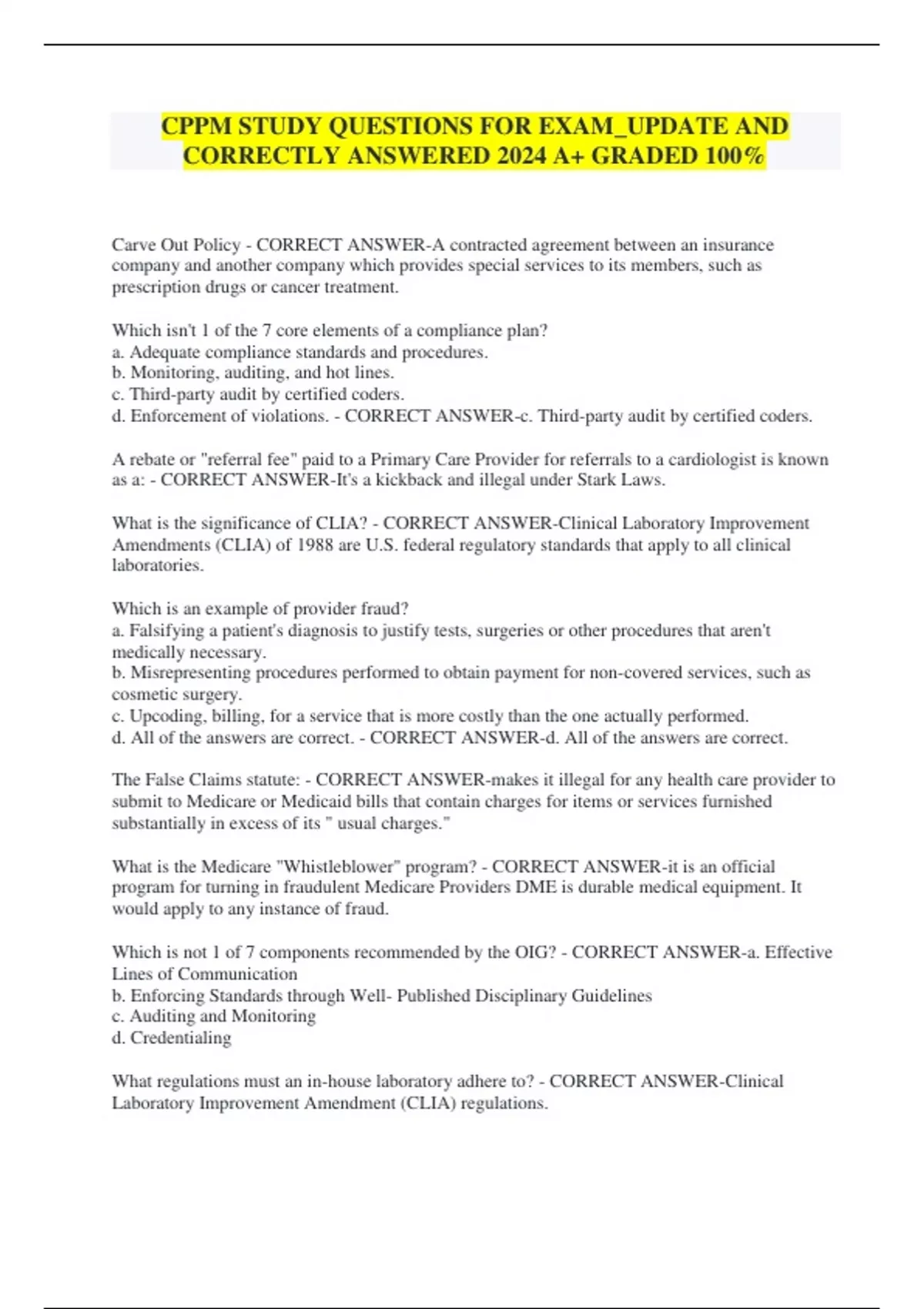 CPPM STUDY QUESTIONS FOR EXAM_UPDATE AND CORRECTLY ANSWERED 2024 A+ GRADED 100% Carve Out Policy - CORRECT ANSWER-A contracted agreement between an insurance company and another company which provides special services to its members, such as prescription drugs or cancer treatment. Which isn't 1 of the 7 core elements of a compliance plan? a. Adequate compliance standards and procedures. b. Monitoring, auditing, and hot lines. c. Third-party audit by certified coders. d. Enforcement of violations. - CORRECT ANSWER-c. Third-party audit by certified coders. A rebate or "referral fee" paid to a Primary Care Provider for referrals to a cardiologist is known as a: - CORRECT ANSWER-It's a kickback and illegal under Stark Laws. What is the significance of CLIA? - CORRECT ANSWER-Clinical Laboratory Improvement Amendments (CLIA) of 1988 are U.S. federal regulatory standards that apply to all clinical laboratories. Which is an example of provider fraud? a. Falsifying a patient's diagnosis to justify tests, surgeries or other procedures that aren't medically necessary. b. Misrepresenting procedures performed to obtain payment for non-covered services, such as cosmetic surgery. c. Upcoding, billing, for a service that is more costly than the one actually performed. d. All of the answers are correct. - CORRECT ANSWER-d. All of the answers are correct. The False Claims statute: - CORRECT ANSWER-makes it illegal for any health care provider to submit to Medicare or Medicaid bills that contain charges for items or services furnished substantially in excess of its " usual charges." What is the Medicare "Whistleblower" program? - CORRECT ANSWER-it is an official program for turning in fraudulent Medicare Providers DME is durable medical equipment. It would apply to any instance of fraud. Which is not 1 of 7 components recommended by the OIG? - CORRECT ANSWER-a. Effective Lines of Communication b. Enforcing Standards through Well- Published Disciplinary Guidelines c. Auditing and Monitoring d. Credentialing What regulations must an in-house laboratory adhere to? - CORRECT ANSWER-Clinical Laboratory Improvement Amendment (CLIA) regulations. Intentional deception or misrepresentation intended to result in an unauthorized benefit is known as: - CORRECT ANSWER-Fraud What is true about the False Claims Act (FCA)? - CORRECT ANSWER-The FCA permits a person with knowledge of fraud against the U.S. Government, to file a lawsuit on behalf of the government against the person or business that committed the fraud. Ther have been several large claims submitted. A kickback is: - CORRECT ANSWER-an offer to pay, solicit, or receive any compensation in any form, either directly or indirectly, in return for referring or generating services or other business for which payment may be made under Medicare or other Federal Health Care Programs. This rule only applies to federal or state programs including Medicare or Medicaid. The False Claims Act (FCA): - CORRECT ANSWER-is a federal statute that covers fraud involving any federally funded contract or program, including Medicare and Medicaid. -establishes liability for any person who knowingly presents or causes to be presented a false or fraudulent claim to the government for payment. -does not require proof of a specific intent to defraud the government. Charging for services that are not medically necessary, do not conform to professionally recognized standards, or are unfairly priced is known as: - CORRECT ANSWER-abuse Emergency services should be provided in accordance with: - CORRECT ANSWER-Emergency Medical Treatment and Active Labor Act (EMTALA) It is permissible to waive patient co-payments or deductibles: - CORRECT ANSWER-never Which is a task that the OIG does not conduct? a. audits, evaluations, and investigations b. providing guidance to industry. c. imposing civil monetary penalties (CMP) d. all of the answers are correct. - CORRECT ANSWER-d. all of the answers are correct. What is the role of JCAHO? - CORRECT ANSWER-operates fee-based, accreditation programs to subscriber hospitals and other healthcare organizations. Which is not a focus of the OIG Work Plan? - CORRECT ANSWER-Training What is the significance of the Stark Laws? - CORRECT ANSWER-These laws prohibit a physician from referring a Medicare patient to an entity for certain designated health services if the physician has a financial relationship with the entity that bills Medicare. A hospital Emergency Department (ED) must be: - CORRECT ANSWER-Accessible 24 hours a day, every day A Medicare Participating Provider is: a. a provider who accepts assignments for Medicare Claims b. a provider who only charges the patient according to the Medicare Fee Schedule. c. who participates in the Medicare Plus Choices Program. d. all of the above - CORRECT ANSWER-d. all of the above What is the definition of a composite APC? - CORRECT ANSWER-Medicare pays a single rate for a service that is reported with a combination of HCPCS comments on the same date or different date of service rather than paying for each procedure or service under a specific APC. CMS has delineated three mechanisms for payment of medical and surgical procedures (inpatient vs outpatient): - CORRECT ANSWER-Outpatient Surgical Services (APC reimbursed procedures not on the "inpatient only" list); Inpatient Surgical Services (DRG reimbursed) Freestanding ASC (Fee-based) Where would one find "timely filing" information for an Insurance Carrier? a. all carriers follow the PFRSRVU Medicare database TFI guidelines b. CPT Manual c. AHA Coding Clinic d. Each carrier publishes their own Timely Filing Period - CORRECT ANSWER-d. Each carrier publishes their own Timely Filing Period Which of the following would be MOST correct concerning ABN's (Advanced Beneficiary Notice? a. ABN's were introduced in 2015 b. ABN's were replaced with the advent of HIPAA c. ABN's would rarely be used in a pediatric facility d. None of the answers are correct. - CORRECT ANSWER-c. AB