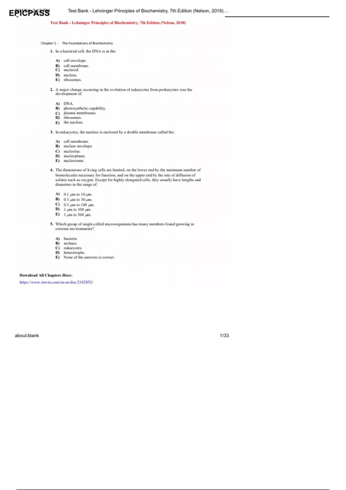 Test Bank - Lehninger Principles of Biochemistry, 7th Edition (Nelson, 2018) 1. In a bacterial cell, the DNA is in the: A) cell envelope. B) cell membrane. C) nucleoid. D) nucleus. E) ribosomes. 2. A major change occurring in the evolution of eukaryotes from prokaryotes was the development of: A) DNA. B) photosynthetic capability. C) plasma membranes. D) ribosomes. E) the nucleus. 3. In eukaryotes, the nucleus is enclosed by a double membrane called the: A) cell membrane. B) nuclear envelope. C) nucleolus. D) nucleoplasm. E) nucleosome. 4. The dimensions of living cells are limited, on the lower end by the minimum number of biomolecules necessary for function, and on the upper end by the rate of diffusion of solutes such as oxygen. Except for highly elongated cells, they usually have lengths and diameters in the range of: A) 0.1 m to 10 m. B) 0.3 m to 30 m. C) 0.3 m to 100 m. D) 1 m to 100 m. E) 1 m to 300 m. 5. Which group of single-celled microorganisms has many members found growing in extreme environments? A) bacteria B) archaea C) eukaryotes D) heterotrophs E) None of the answers is correct. Test Bank - Lehninger Principles of Biochemistry, 7th Edition (Nelson, 2018) Download All Chapters Here: EPICPASS 3/11/24, 2:13 PM Test Bank - Lehninger Principles of Biochemistry, 7th Edition (Nelson, 2018)… about:blank 2/33 6. The bacterium E. coli requires simple organic molecules for growth and energy—it is therefore a: A) chemoautotroph. B) chemoheterotroph. C) lithotroph. D) photoautotroph. E) photoheterotroph. 7. Which is a list of organelles? A) mitochondria, chromatin, endoplasmic reticulum B) peroxisomes, lysosomes, plasma membrane C) proteasomes, peroxisomes, lysosomes D) mitochondria, endoplasmic reticulum, peroxisomes E) All of the answers are correct. 8. Which list has the cellular components arranged in order of INCREASING size? A) amino acid protein mitochondrion ribosome B) amino acid protein ribosome mitochondrion C) amino acid ribosome protein mitochondrion D) protein amino acid mitochondrion ribosome E) protein ribosome mitochondrion amino acid 9. The three-dimensional structure of macromolecules is formed and maintained primarily through noncovalent interactions. Which one of the following is NOT considered a noncovalent interaction? A) carbon-carbon bonds B) hydrogen bonds C) hydrophobic interactions D) ionic interactions E) van der Waals interactions 10. Which element is NOT among the four most abundant in living organisms? A) carbon B) hydrogen C) nitrogen D) oxygen E) phosphorus Test Bank - Lehninger Principles of Biochemistry, 7th Edition (Nelson, 2018) Download All Chapters Here: EPICPASS 3/11/24, 2:13 PM Test Bank - Lehninger Principles of Biochemistry, 7th Edition (Nelson, 2018)… about:blank 3/33 11. The four covalent bonds in methane (CH4) are arranged around carbon to give which geometry? A) linear B) tetrahedral C) trigonal bipyramidal D) trigonal planar E) trigonal pyramidal 12. What functional groups are present on this molecule? A) ether and aldehyde B) hydroxyl and aldehyde C) hydroxyl and carboxylic acid D) hydroxyl and ester E) hydroxyl and ketone 13. The macromolecules that serve in the storage and transmission of genetic information are: A) carbohydrates. B) lipids. C) membranes. D) nucleic acids. E) proteins. 14. Stereoisomers that are nonsuperimposable mirror images of each other are known as: A) anomers. B) cis-trans isomers. C) diastereoisomers. D) enantiomers. E) geometric isomers. Test Bank - Lehninger Principles of Biochemistry, 7th Edition (Nelson, 2018) Download All Chapters Here: EPICPASS 3/11/24, 2:13 PM Test Bank - Lehninger Principles of Biochemistry, 7th Edition (Nelson, 2018)… about:blank 4/33 15. The catalog of all proteins functioning in a cell is the: A) metabolome. B) proteasome. C) lysosome. D) proteome. E) genome. 16. Use the terms a) chemoautotrophs, b) chemoheterotrophs, c) photoautotrophs, and d) photoheterotrophs and identify the answer that CORRECTLY finishes the statement: Carnivores are _____ and herbivores are _____. A) b; c B) b; d C) b; b D) a; b E) a; a 17. The enzyme fumarase catalyzes the reversible hydration of fumaric acid to l-malate, but it will not catalyze the hydration of maleic acid, the cis isomer of fumaric acid. This is an example of: A) biological activity. B) chiral activity. C) racemization. D) stereoisomerization. E) stereospecificity. 18. Humans maintain a nearly constant level of hemoglobin by continually synthesizing and degrading it. This is an example of a(n): A) dynamic steady state. B) equilibrium state. C) exergonic change. D) free-energy change. E) waste of energy. 19. If heat energy is absorbed by the system during a chemical reaction, the reaction is said to be: A) at equilibrium. B) endergonic. C) endothermic. D) exergonic. E) exothermic.