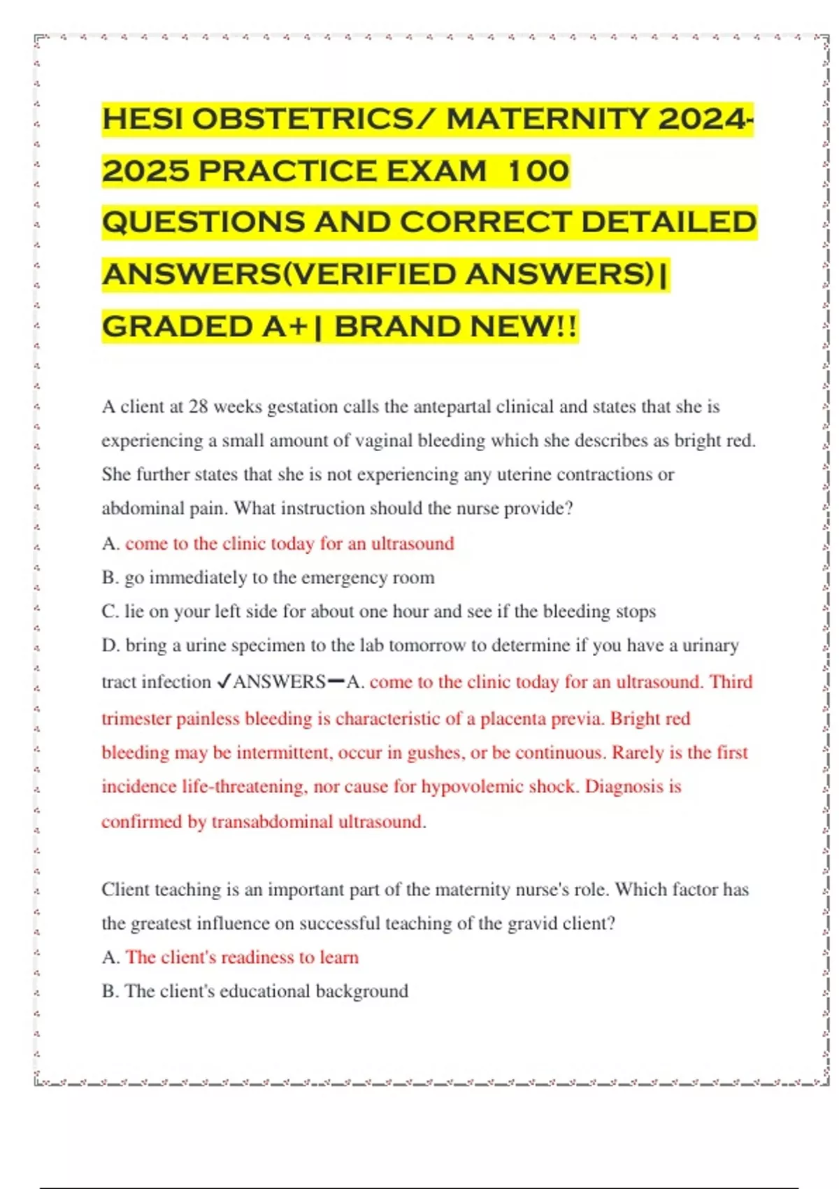 HESI OBSTETRICS/ MATERNITY 2024- 2025 PRACTICE EXAM 100 QUESTIONS AND CORRECT DETAILED ANSWERS(VERIFIED ANSWERS)| GRADED A+| BRAND NEW!! A client at 28 weeks gestation calls the antepartal clinical and states that she is experiencing a small amount of vaginal bleeding which she describes as bright red. She further states that she is not experiencing any uterine contractions or abdominal pain. What instruction should the nurse provide? A. come to the clinic today for an ultrasound
