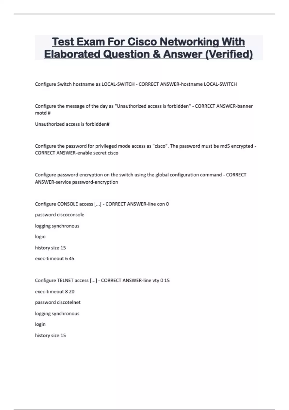 Test Exam For Cisco Networking With Elaborated Question & Answer (Verified) Configure Switch hostname as LOCAL-SWITCH - CORRECT ANSWER-hostname LOCAL-SWITCH Configure the message of the day as "Unauthorized access is forbidden" - CORRECT ANSWER-banner motd # Unauthorized access is forbidden# Configure the password for privileged mode access as "cisco". The password must be md5 encrypted - CORRECT ANSWER-enable secret cisco Configure password encryption on the switch using the global configuration command - CORRECT ANSWER-service password-encryption