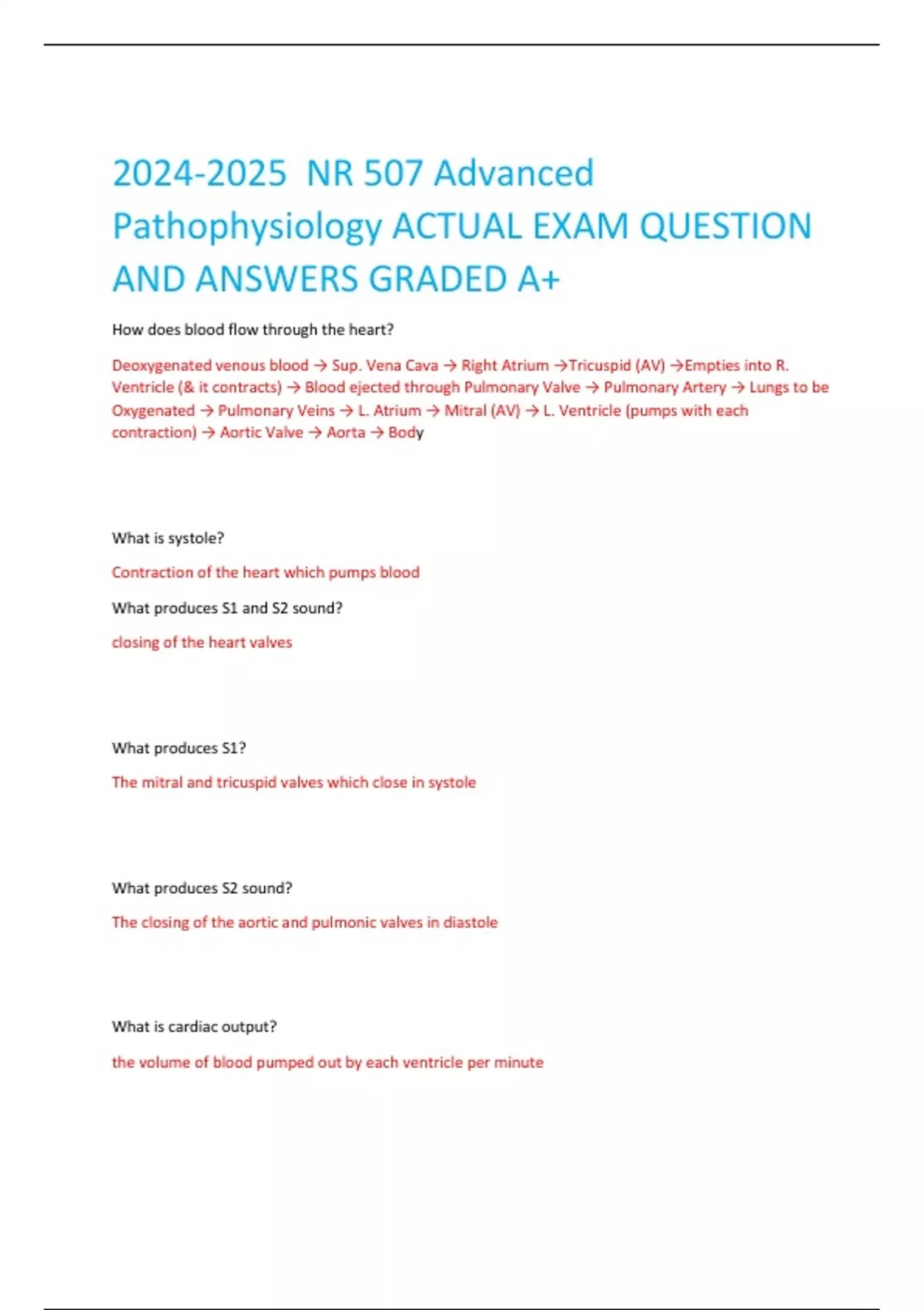 2024 -2025 NR 507 Advanced Pathophysiology ACTUAL EXAM QUESTION AND ANSWERS GRADED A+ How does blood flow through the heart? Deoxygenated venous blood → Sup. Vena Cava → Right Atrium →Tricuspid (AV) →Empties into R. Ventricle (& it contracts) → Blood ejected through Pulmonary Valve → Pulmonary Artery → Lungs to be Oxygenated → Pulmonary Veins → L. Atrium → Mitral (AV) → L. Ventricle (pumps with each contraction) → Aortic Valve → Aorta → Bod y What is systole? Contraction of the heart which pumps blood What produces S1 and S2 sound? closing of the heart valves What produces S1? The mitral and tricuspid valves which close in systole What produces S2 sound? The closing of the aortic and pulmonic valves in diastole What is cardiac output? the volume o f blood pumped out by each ventricle per minute What is stroke volume? amount of blood pumped out by each ventricle with contraction What determines cardiac output? stroke volume and heart rate What is preload? the degree of stretch on the heart before it contracts, related to ventricular filling, end diastolic pressure, amount of blood entering the ventricle during diastole What is afterload? resistance left ventricle must overcome to circulate blood What is contractility? Normal ability of muscle to contract at a given force for a given stretch. It is independent of preload/afterload Will sustained tachycardia result in increased or decreased stroke volume? Decreased What conditions can result in decreas ed contractility? Ischemia, acidosis, cardiomyopathy