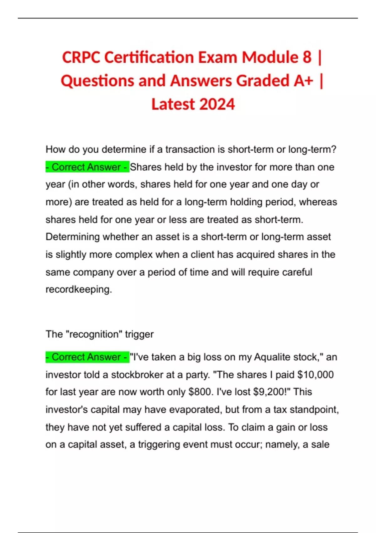 CRPC Certification Exam Module 8 | Questions and Answers Graded A+ | Latest 2024