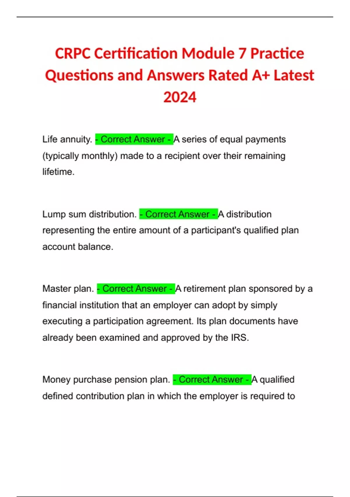 CRPC Certification Module 7 Practice Questions and Answers Rated A+ Latest 2024