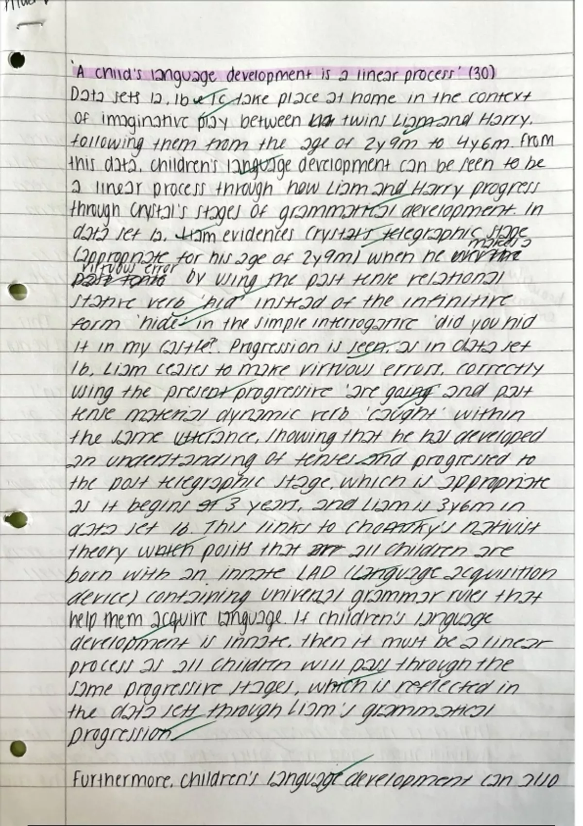 This is an example essay for Alevel English Language Paper 1 Question 4 (spoken child language acquisition) in response to the statement “a child’s language development is a linear process.” The essay achieved 29 out of 30 marks which is equivalent to an A*, receiving 14 out of 15 marks for AO1 (terminology) and 15 out of 15 marks for AO2 (theory). The essay explores both nature and nurture arguments, intricately weaving in the given transcript and evaluating critically to draw a conclusion.