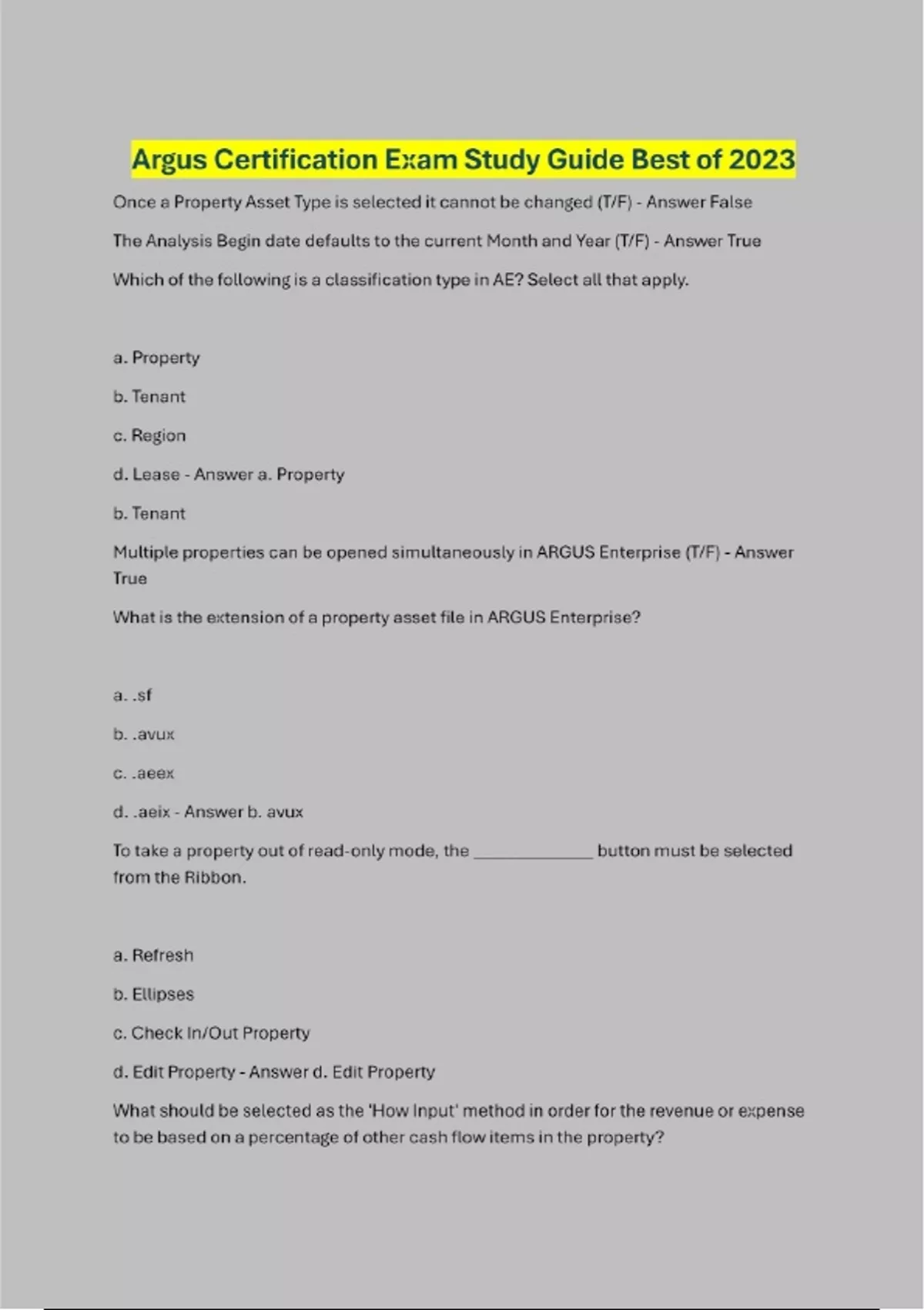 Once a Property Asset Type is selected it cannot be changed (T/F) - Answer False The Analysis Begin date defaults to the current Month and Year (T/F) - Answer True Which of the following is a classification type in AE? Select all that apply. a. Property b. Tenant c. Region d. Lease - Answer a. Property b. Tenant Multiple properties can be opened simultaneously in ARGUS Enterprise (T/F) - Answer True What is the extension of a property asset file in ARGUS Enterprise? a. .sf b. .avux c. .aeex d. .aeix - Answer b. avux To take a property out of read-only mode, the ______________ button must be selected from the Ribbon. a. Refresh b. Ellipses c. Check In/Out Property d. Edit Property - Answer d. Edit Property What should be selected as the 'How Input' method in order for the revenue or expense to be based on a percentage of other cash flow items in the property?