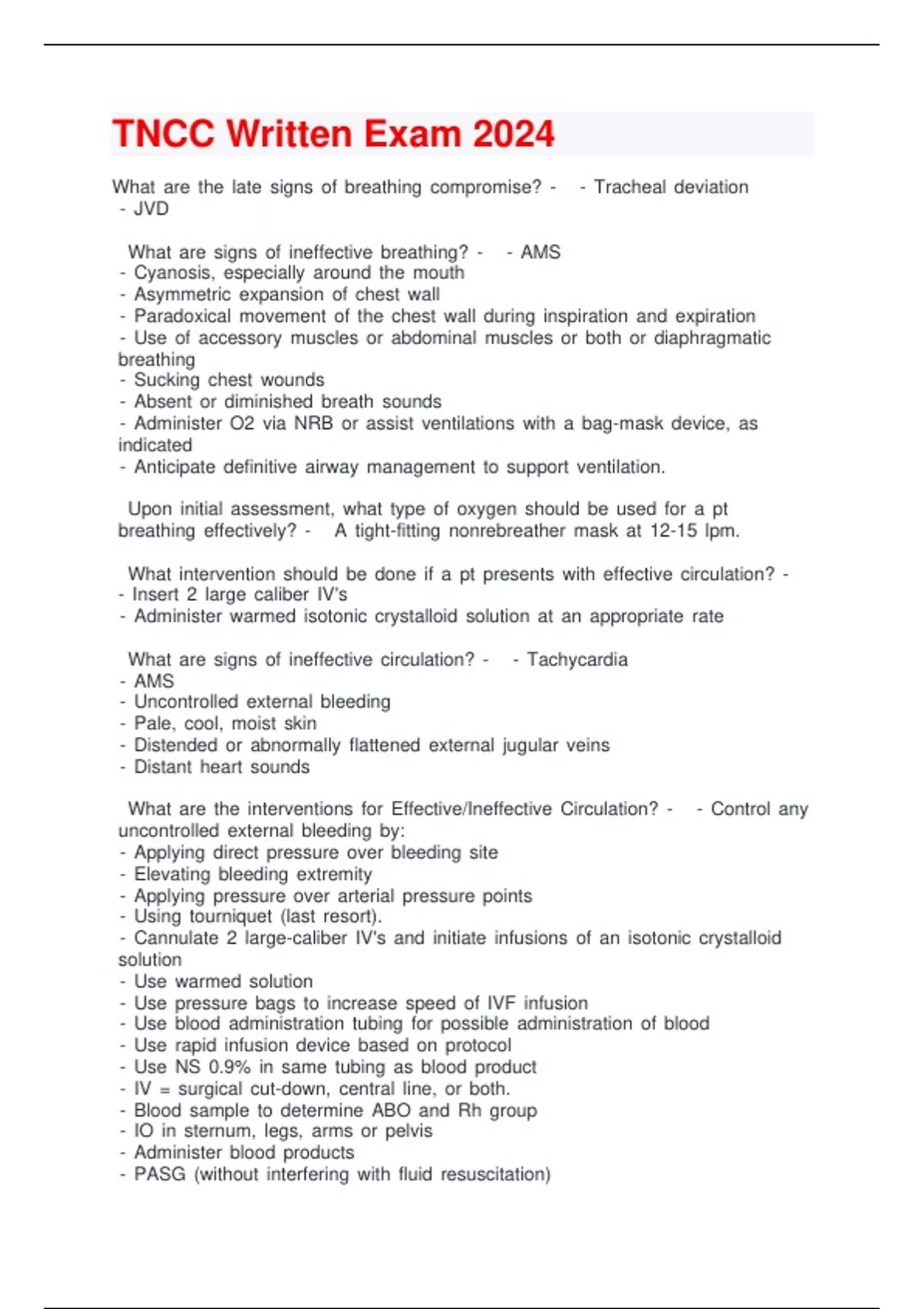 TNCC Written Exam 2024 What ccare ccthe cclate ccsigns ccof ccbreathing cccompromise? cc- cc cc cc- ccTracheal ccdeviation cc- ccJVD cc ccWhat ccare ccsigns ccof ccineffective ccbreathing? cc- cc cc cc- ccAMS cc- ccCyanosis, ccespecially ccaround ccthe ccmouth cc- ccAsymmetric ccexpansion ccof ccchest ccwall cc- ccParadoxical ccmovement ccof ccthe ccchest ccwall ccduring ccinspiration ccand ccexpiration cc- ccUse ccof ccaccessory ccmuscles ccor ccabdominal ccmuscles ccor ccboth ccor ccdiaphragmatic ccbreathing cc- ccSucking ccchest ccwounds cc cc- ccAbsent ccor ccdiminished ccbreath ccsounds cc- ccAdminister ccO2 ccvia ccNRB ccor ccassist ccventilations ccwith cca ccbag-mask ccdevice, ccas ccindicated cc- ccAnticipate ccdefinitive ccairway ccmanagement ccto ccsupport ccventilation. cc ccUpon ccinitial ccassessment, ccwhat cctype ccof ccoxygen ccshould ccbe ccused ccfor cca ccpt ccbreathing cceffectively? cc- cc cc ccA cctight-fitting ccnonrebreather ccmask ccat cc12-15 cclpm. cc ccWhat ccintervention ccshould ccbe ccdone ccif cca ccpt ccpresents ccwith cceffective cccirculation? cc- cc cc cc- ccInsert cc2 cclarge cccaliber ccIV's cc- ccAdminister ccwarmed ccisotonic cccrystalloid ccsolution ccat ccan ccappropriate ccrate cc ccWhat ccare ccsigns ccof ccineffective cccirculation? cc- cc cc cc- ccTachycardia cc- ccAMS cc- ccUncontrolled ccexternal ccbleeding cc- ccPale, cccool, ccmoist ccskin cc- ccDistended ccor ccabnormally ccflattened ccexternal ccjugular ccveins cc- ccDistant ccheart ccsounds cc ccWhat ccare ccthe ccinterventions ccfor ccEffective/Ineffective ccCirculation? cc- cc cc cc- ccControl ccany ccuncontrolled ccexternal ccbleeding ccby: cc- ccApplying ccdirect ccpressure ccover ccbleeding ccsite cc- ccElevating ccbleeding ccextremity cc- ccApplying ccpressure ccover ccarterial ccpressure ccpoints cc- ccUsing cctourniquet cc(last ccresort). cc- ccCannulate cc2 cclarge -caliber ccIV's ccand ccinitiate ccinfusions ccof ccan ccisotonic cccrystalloid ccsolution cc- ccUse ccwarmed ccsolution cc- ccUse ccpressure ccbags ccto ccincrease ccspeed ccof ccIVF ccinfusion cc- ccUse ccblood ccadministration cctubing ccfor ccpossible ccadministration ccof ccblood cc- ccUse ccrapid ccinfusion ccdevice ccbased ccon ccprotocol cc- ccUse ccNS cc0.9% ccin ccsame cctubing ccas ccblood ccproduct cc- ccIV cc= ccsurgical cccut-down, cccentral ccline, ccor ccboth. cc- ccBlood ccsample ccto ccdetermine ccABO ccand ccRh ccgroup cc- ccIO ccin ccsternum, cclegs, ccarms ccor ccpelvis cc- ccAdminister ccblood ccproducts cc- ccPASG cc(without ccinterfering ccwith ccfluid ccresuscitation) cc ccWhat ccare ccfactors ccthat cccontribute ccto ccineffective ccventilation? cc- cc cc cc- ccAMS cc- ccLOC cc- ccNeurologic ccinjury cc- ccSpinal ccCord ccInjury cc- ccIntracranial ccInjury cc- ccBlunt cctrauma cc- ccPain cccaused ccby ccrib ccfractures cc- ccPenetrating ccTrauma cc- ccPreexisting cchx ccof ccrespiratory ccdiseases cc- ccIncreased ccage cc ccWhat ccmedications ccare ccused ccduring ccintubation? cc- cc cc ccLOAD ccMnemonic: ccL cc= ccLidocaine ccO cc= ccOpioids ccA cc= ccAtropine ccD cc= ccDefasiculating ccagents cc ccWhat ccare ccthe ccRapid ccSequence ccIntubation ccSteps? cc- cc cc ccPREPARATION: cc cc- ccgather ccequipment, ccstaffing, ccetc. PREOXYGENATION: cc cc- ccUse cc100% ccO2 cc(prevent ccrisk ccof ccaspiration). PRETREATMENT: cc cc- ccDecrease ccS/E's ccof ccintubation PARALYSIS ccWITH ccINDUCTION: cc cc- ccPt cchas ccLOC, ccthen ccadminister ccneuromuscular ccblocking ccagent PROTECTION ccAND ccPOSITIONING: cc cc- ccApply ccpressure ccover cccricoid cccartilage cc(minimizes cclikelihood ccof ccvomiting ccand ccaspiration PLACEMENT ccWITH ccPROOF cc- ccEach ccattempt ccNOT ccto ccexceed cc30 ccseconds, ccmax ccof cc3 ccattempts. ccVentilate ccpt cc30-