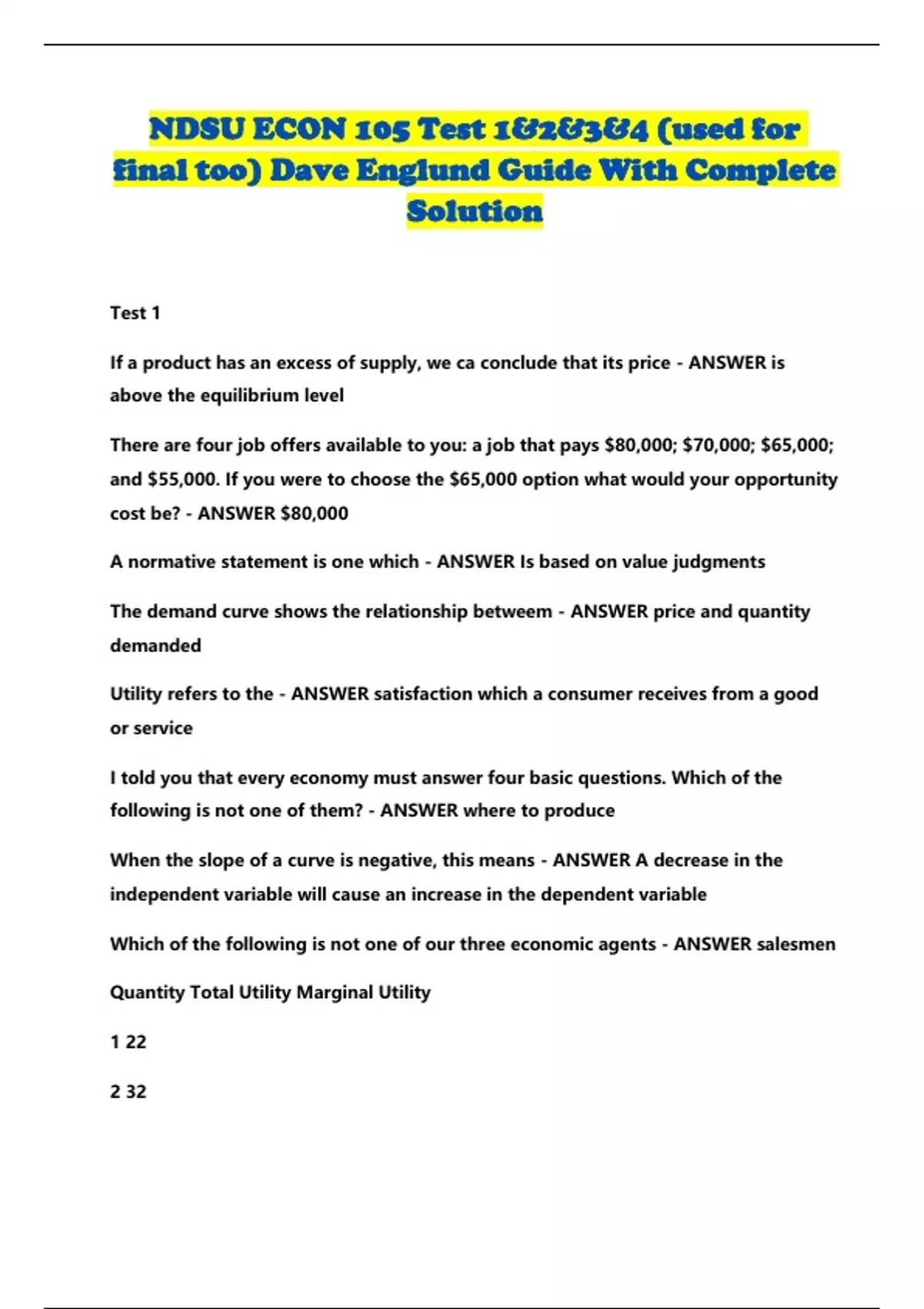 NDSU ECON 105 Test 1&2&3&4 (used for final too) Dave Englund Guide With Complete Solution