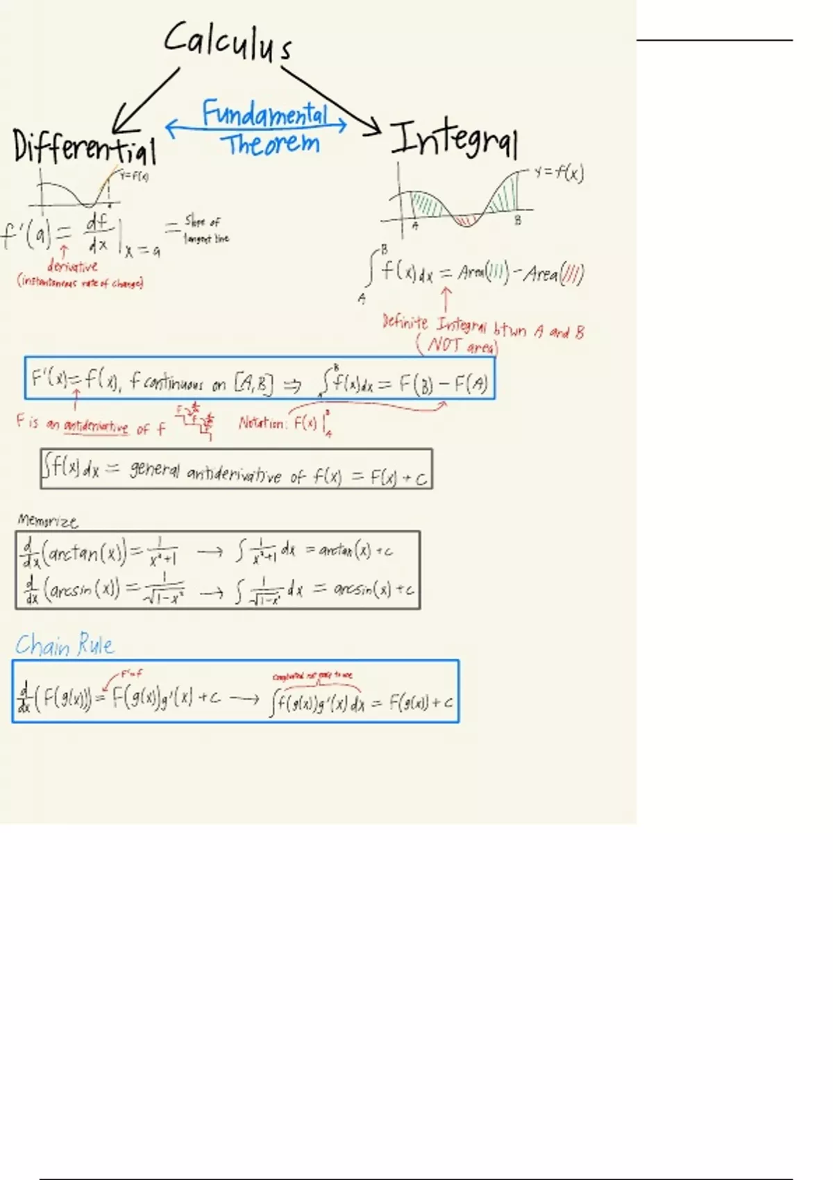 Calculus/-fundament-IntegralDifferentialTheorem-##MII"**f(a)(-(x)dx=Area)(1)-Area(11)(instantaneousrateofchangeA↑DefiniteIntegralbtwnAandB(NOTarea)f'(x)=f(x),fcontinuouson[A,B]=( (ax=->(B)-F(t)↑-tisanantiderrativeofNotation:f(x)St(x)dx=generalantiderivativeoff(x)=f(x)+cmemorize*Carctan(x))=->Sidx=arctan(x)+c↑Carcsin(x))=->Sidx=arcsin(x)+cChainRuley=fcomplicated,noteasytouseS-(f(g(x)))=f(g(x))g,(x)+c-(+(g(x)(g'(x)dx=f(g(x))+c