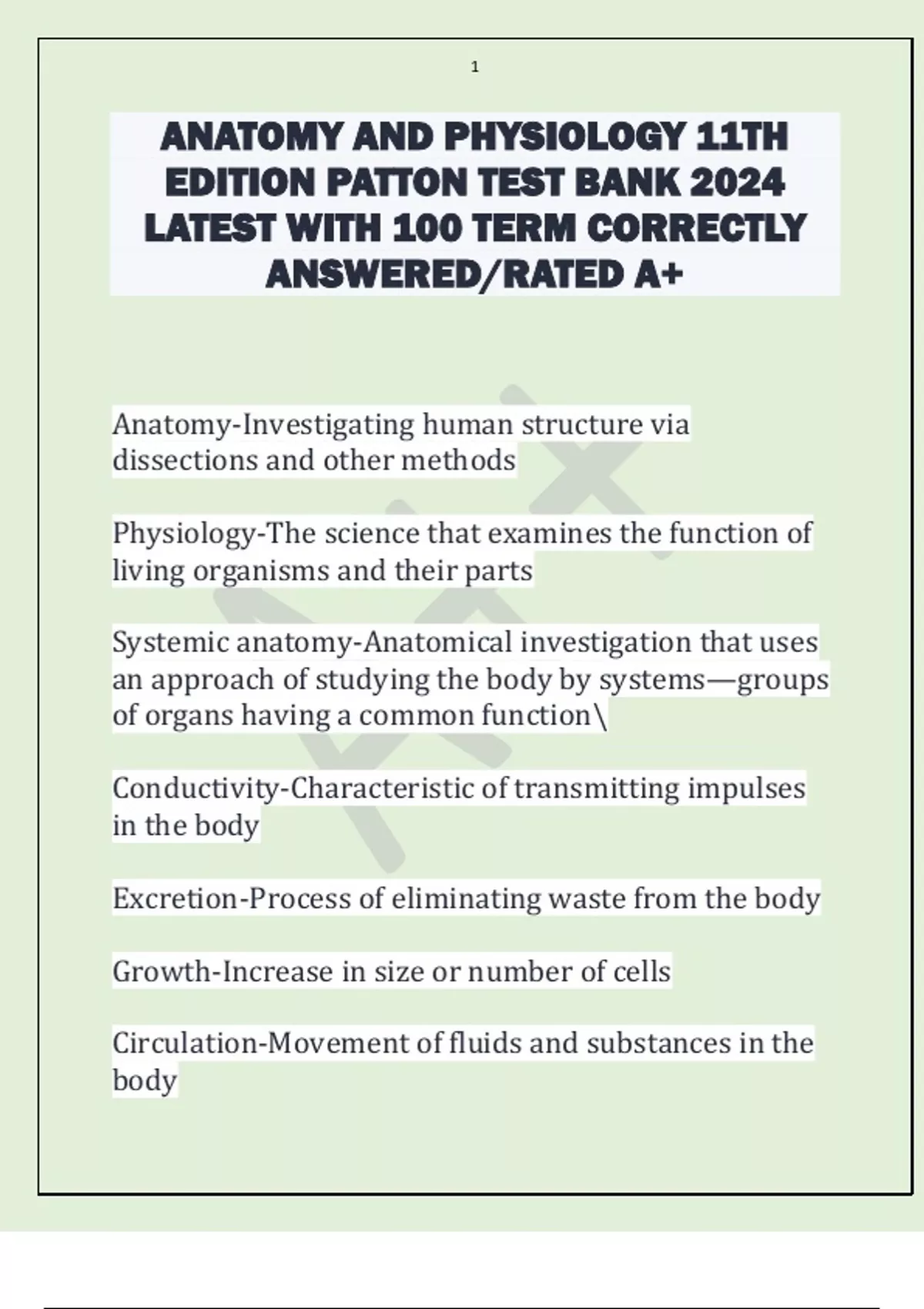 ANATOMY AND PHYSIOLOGY 11TH EDITION PATTON TEST BANK 2024 LATEST WITH 100 TERM CORRECTLY ANSWERED/RATED A+
