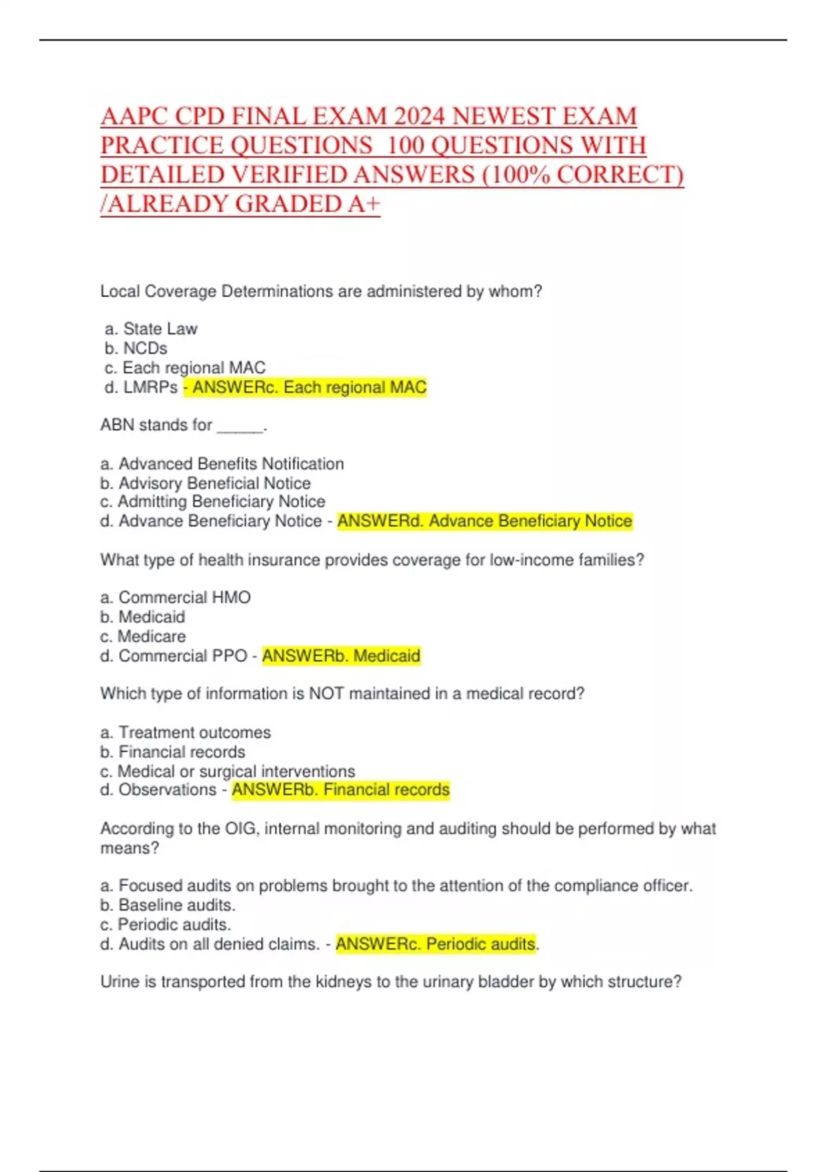 AAPC CPD FINAL EXAM 2024 NEWEST EXAM PRACTICE QUESTIONS 100 QUESTIONS WITH DETAILED VERIFIED ANSWERS (100% CORRECT) /ALREADY GRADED A+