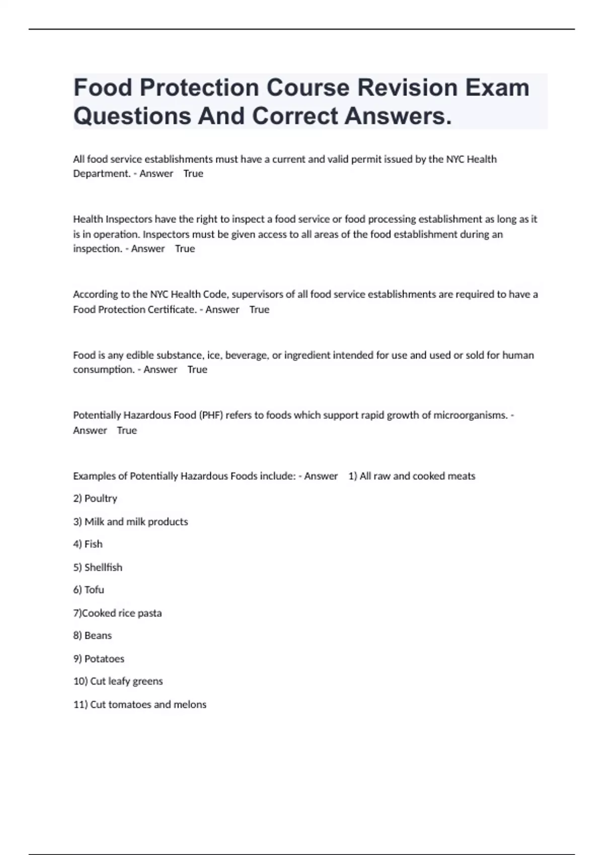 All food service establishments must have a current and valid permit issued by the NYC Health Department. - Answer True Health Inspectors have the right to inspect a food service or food processing establishment as long as it is in operation. Inspectors must be given access to all areas of the food establishment during an inspection. - Answer True According to the NYC Health Code, supervisors of all food service establishments are required to have a Food Protection Certificate. - Answer True Food is any edible substance, ice, beverage, or ingredient intended for use and used or sold for human consumption. - Answer True Potentially Hazardous Food (PHF) refers to foods which support rapid growth of microorganisms. - Answer True Examples of Potentially Hazardous Foods include: - Answer 1) All raw and cooked meats 2) Poultry 3) Milk and milk products 4) Fish 5) Shellfish 6) Tofu 7)Cooked rice pasta 8) Beans 9) Potatoes 10) Cut leafy greens 11) Cut tomatoes and melons