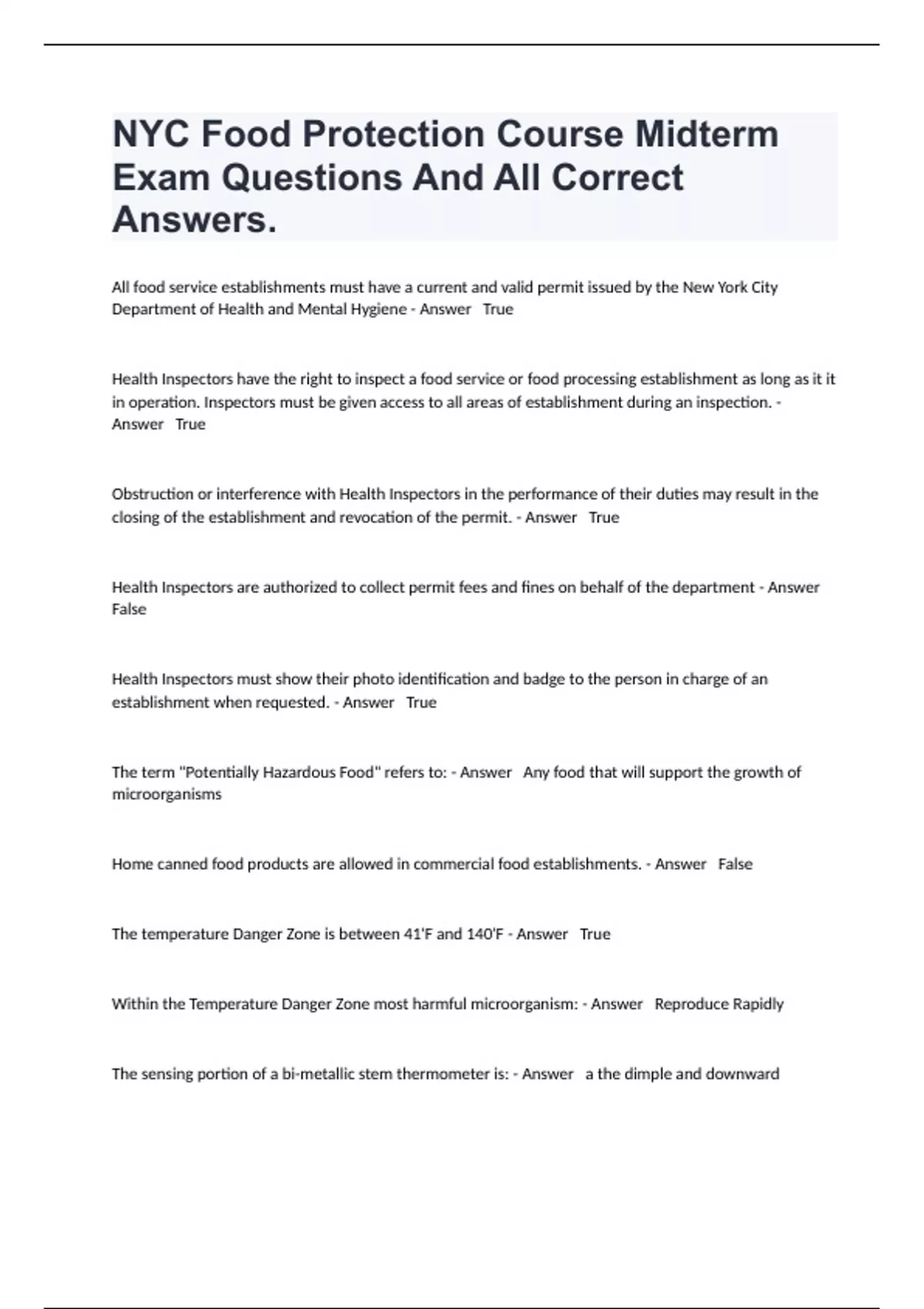 NYC Food Protection Course Midterm Exam Questions And All Correct Answers.